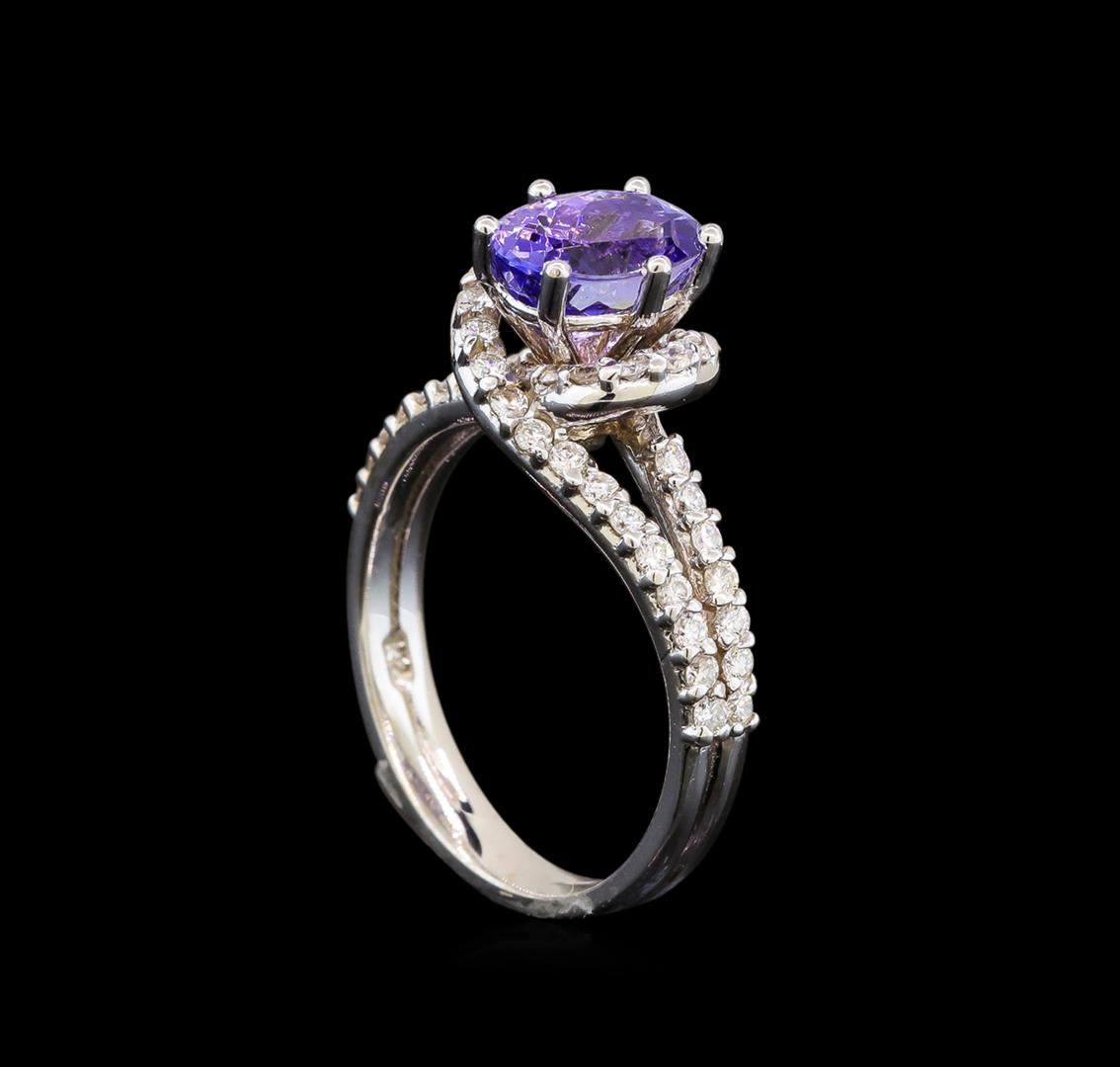One electronically tested 14KT white gold ladies cast tanzanite and diamond ring with a bright polish finish. Identified with markings of "14K". Condition is new. Containing: One prong set oval modified brilliant cut natural tanzanite, measuring 8.50 x 7.40 x 4.81mm, approximate weight of 2.13ct., clarity is eye clean, type I, medium light, very slightly grayish, violet color, (GIA V 4/3), cut is good. Fifty prong set round brilliant cut diamonds, measuring 1.50 - 1.50 x 0.90mm (depth est.) approximate total weight of 50 Stones = 0.62ct. Clarity: SI-1 to SI-2. Color: I - J, Cut is Good. Colored gemstones are presumed to have been subjected to commonly used enhancement processes. All diamonds and colored gemstones are graded in the mounting, unless otherwise stated. Total Weight of Colored Stones 2.13ct. Total Weight of Diamonds 0.62ct. Total Weight of Ring 5.10 grams. GGL Appraised at $3,495.00.