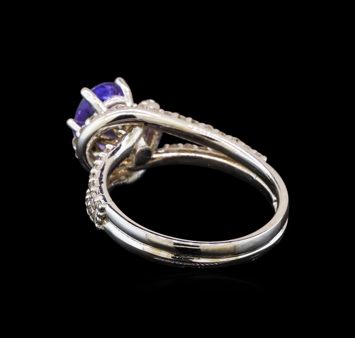 One electronically tested 14KT white gold ladies cast tanzanite and diamond ring with a bright polish finish. Identified with markings of "14K". Condition is new. Containing: One prong set oval modified brilliant cut natural tanzanite, measuring 8.50 x 7.40 x 4.81mm, approximate weight of 2.13ct., clarity is eye clean, type I, medium light, very slightly grayish, violet color, (GIA V 4/3), cut is good. Fifty prong set round brilliant cut diamonds, measuring 1.50 - 1.50 x 0.90mm (depth est.) approximate total weight of 50 Stones = 0.62ct. Clarity: SI-1 to SI-2. Color: I - J, Cut is Good. Colored gemstones are presumed to have been subjected to commonly used enhancement processes. All diamonds and colored gemstones are graded in the mounting, unless otherwise stated. Total Weight of Colored Stones 2.13ct. Total Weight of Diamonds 0.62ct. Total Weight of Ring 5.10 grams. GGL Appraised at $3,495.00.