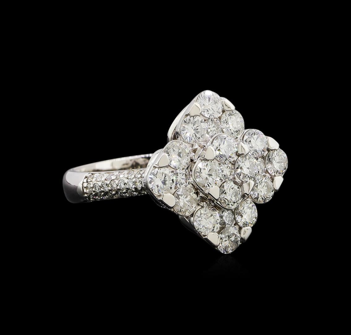 One electronically tested 14KT white gold ladies cast diamond ring. Identified with markings of "K14". Condition is new. Containing: Forty-Four prong set round brilliant cut diamonds, measuring 1.30 - 1.30 x 0.78mm (depth est.) approximate total weight of 44 Stones = 0.35ct. Clarity: I-1 to I-2. Color: I - J, Cut is Good. Twenty-One prong set round brilliant cut diamonds, measuring 3.00 - 2.00 x 1.50mm (depth est.) approximate total weight of 21 Stones = 1.79ct. Clarity: SI-2 to I-2. Color: I - J, Cut is Good. Diamonds are graded in the mounting, unless otherwise stated. Total Weight of Diamonds 2.14ct. Total Weight of Ring 6.80 grams. GGL Appraised at $5,065.00.
