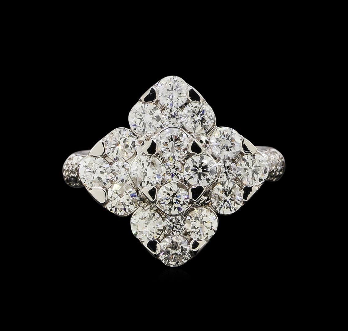 One electronically tested 14KT white gold ladies cast diamond ring. Identified with markings of "K14". Condition is new. Containing: Forty-Four prong set round brilliant cut diamonds, measuring 1.30 - 1.30 x 0.78mm (depth est.) approximate total weight of 44 Stones = 0.35ct. Clarity: I-1 to I-2. Color: I - J, Cut is Good. Twenty-One prong set round brilliant cut diamonds, measuring 3.00 - 2.00 x 1.50mm (depth est.) approximate total weight of 21 Stones = 1.79ct. Clarity: SI-2 to I-2. Color: I - J, Cut is Good. Diamonds are graded in the mounting, unless otherwise stated. Total Weight of Diamonds 2.14ct. Total Weight of Ring 6.80 grams. GGL Appraised at $5,065.00.