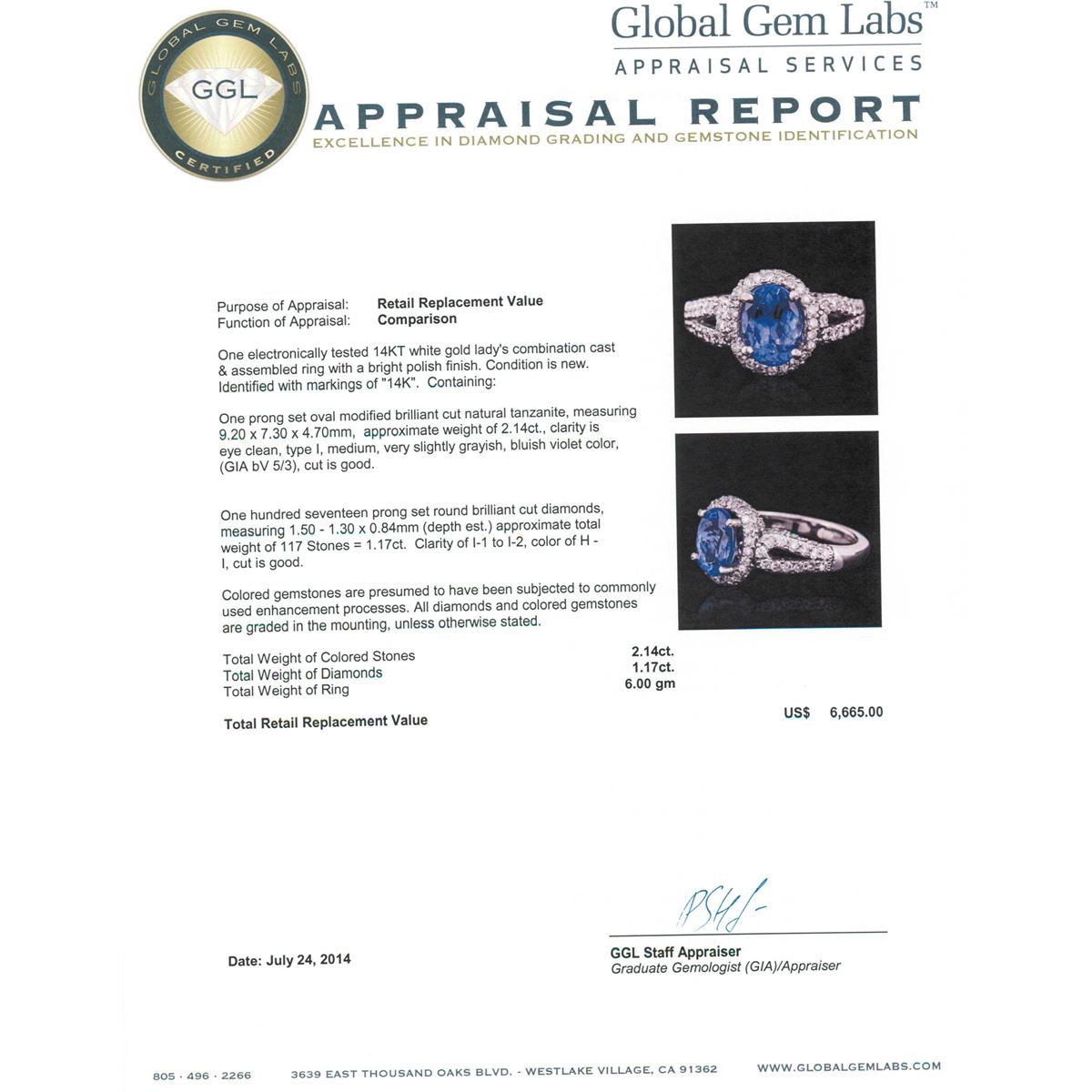 One electronically tested 14KT white gold ladies combination cast & assembled ring with a bright polish finish. Condition is new. Identified with markings of "14K". Containing: One prong set oval modified brilliant cut natural tanzanite, measuring 9.20 x 7.30 x 4.70mm, approximate weight of 2.14ct., clarity is eye clean, type I, medium, very slightly grayish, bluish violet color, (GIA bV 5/3), cut is good. One Hundred Seventeen prong set round brilliant cut diamonds, measuring 1.50 - 1.30 x 0.84mm (depth est.) approximate total weight of 117 Stones = 1.17ct. Clarity: I-1 to I-2. Color: H - I, Cut is Good. Colored gemstones are presumed to have been subjected to commonly used enhancement processes. All diamonds and colored gemstones are graded in the mounting, unless otherwise stated. Total Weight of Colored Stones 2.14ct. Total Weight of Diamonds 1.17ct. Total Weight of Ring 6.00 grams. GGL Appraised at $6,665.00.