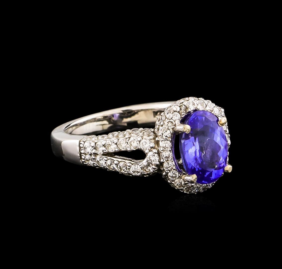 One electronically tested 14KT white gold ladies combination cast & assembled ring with a bright polish finish. Condition is new. Identified with markings of "14K". Containing: One prong set oval modified brilliant cut natural tanzanite, measuring 9.20 x 7.30 x 4.70mm, approximate weight of 2.14ct., clarity is eye clean, type I, medium, very slightly grayish, bluish violet color, (GIA bV 5/3), cut is good. One Hundred Seventeen prong set round brilliant cut diamonds, measuring 1.50 - 1.30 x 0.84mm (depth est.) approximate total weight of 117 Stones = 1.17ct. Clarity: I-1 to I-2. Color: H - I, Cut is Good. Colored gemstones are presumed to have been subjected to commonly used enhancement processes. All diamonds and colored gemstones are graded in the mounting, unless otherwise stated. Total Weight of Colored Stones 2.14ct. Total Weight of Diamonds 1.17ct. Total Weight of Ring 6.00 grams. GGL Appraised at $6,665.00.