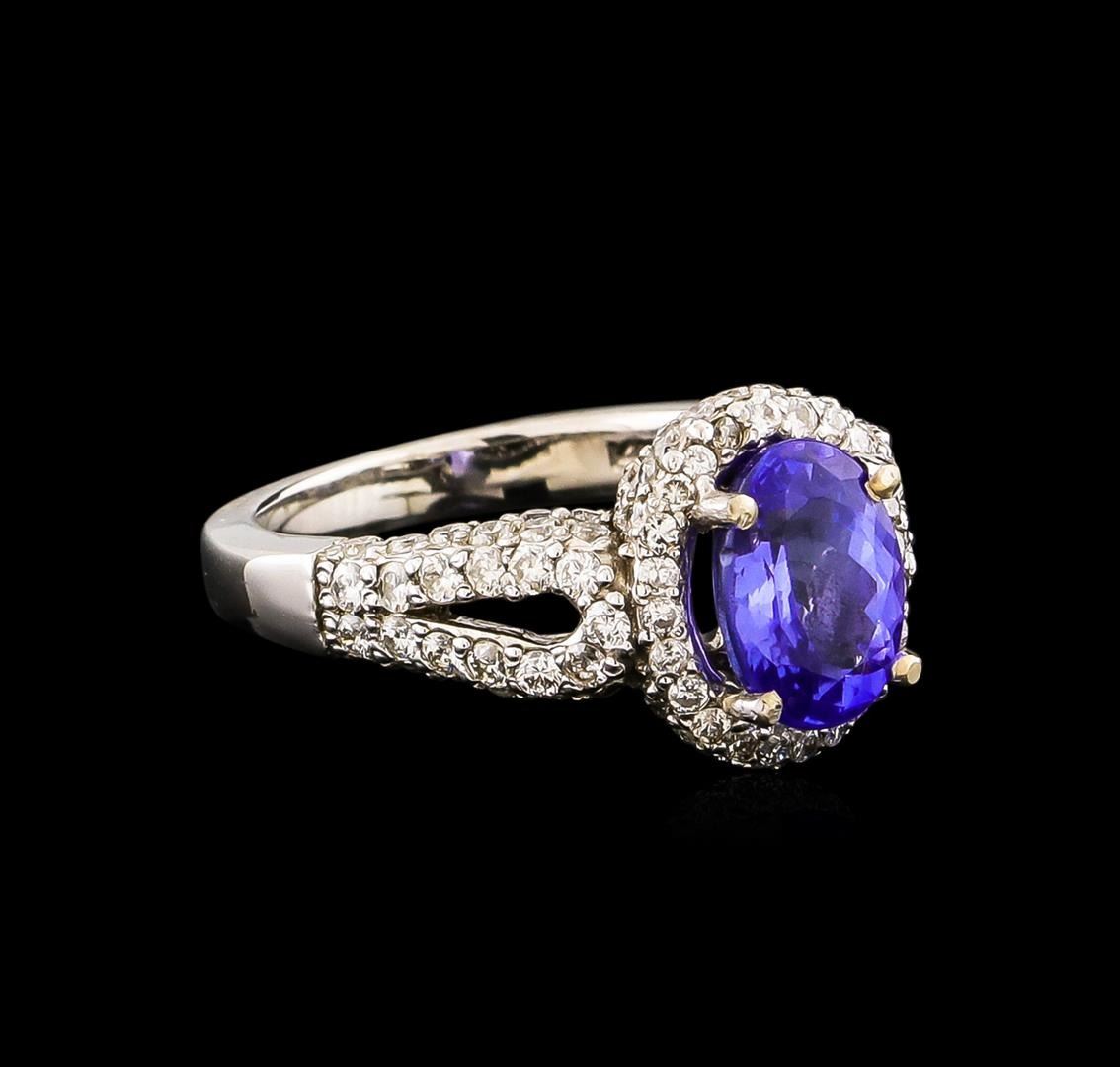 One electronically tested 14KT white gold ladies combination cast & assembled ring with a bright polish finish. Condition is new. Identified with markings of "14K". Containing: One prong set oval modified brilliant cut natural tanzanite, measuring 9.20 x 7.30 x 4.70mm, approximate weight of 2.14ct., clarity is eye clean, type I, medium, very slightly grayish, bluish violet color, (GIA bV 5/3), cut is good. One Hundred Seventeen prong set round brilliant cut diamonds, measuring 1.50 - 1.30 x 0.84mm (depth est.) approximate total weight of 117 Stones = 1.17ct. Clarity: I-1 to I-2. Color: H - I, Cut is Good. Colored gemstones are presumed to have been subjected to commonly used enhancement processes. All diamonds and colored gemstones are graded in the mounting, unless otherwise stated. Total Weight of Colored Stones 2.14ct. Total Weight of Diamonds 1.17ct. Total Weight of Ring 6.00 grams. GGL Appraised.