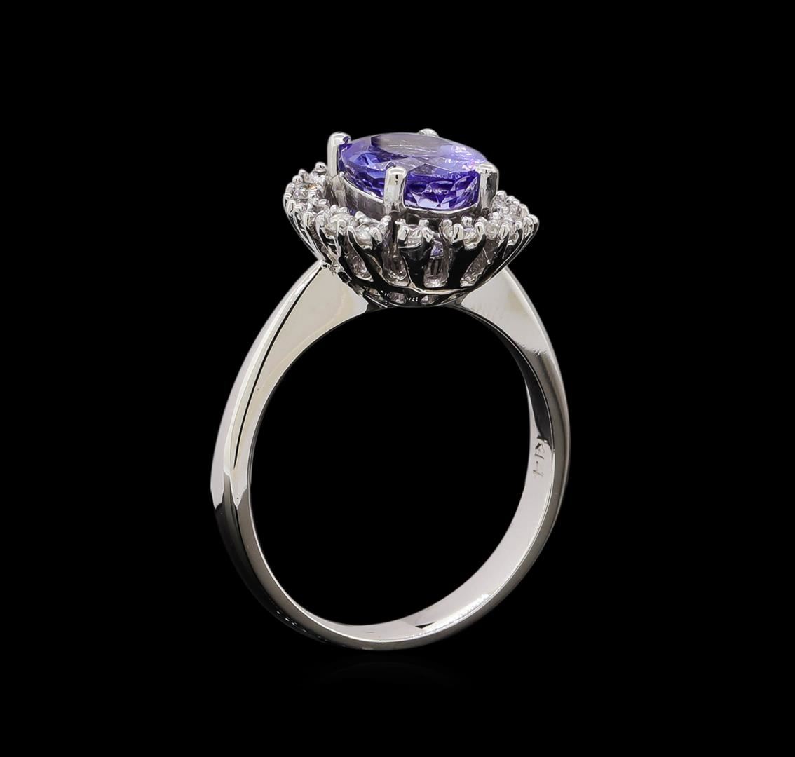 One electronically tested 14KT white gold ladies cast tanzanite and diamond ring with a bright polish finish. Identified with markings of "14K". Condition is new. Containing: One prong set oval modified brilliant cut natural tanzanite, measuring 9.00 x 7.00 x 4.88mm, approximate weight of 2.16ct., clarity is eye clean, type I, medium light, very slightly grayish, violet color, (GIA V 4/3), cut is good. Sixteen prong set round brilliant cut diamonds, measuring 1.60 - 1.60 x 0.96mm (depth est.) approximate total weight of 16 Stones = 0.24ct. Clarity: SI-1 to SI-2. Color: I - J, Cut is Good. Colored gemstones are presumed to have been subjected to commonly used enhancement processes. All diamonds and colored gemstones are graded in the mounting, unless otherwise stated. Total Weight of Colored Stones 2.16ct. Total Weight of Diamonds 0.24ct. Total Weight of Ring 5.10 grams. GGL Appraised at $3,000.00.