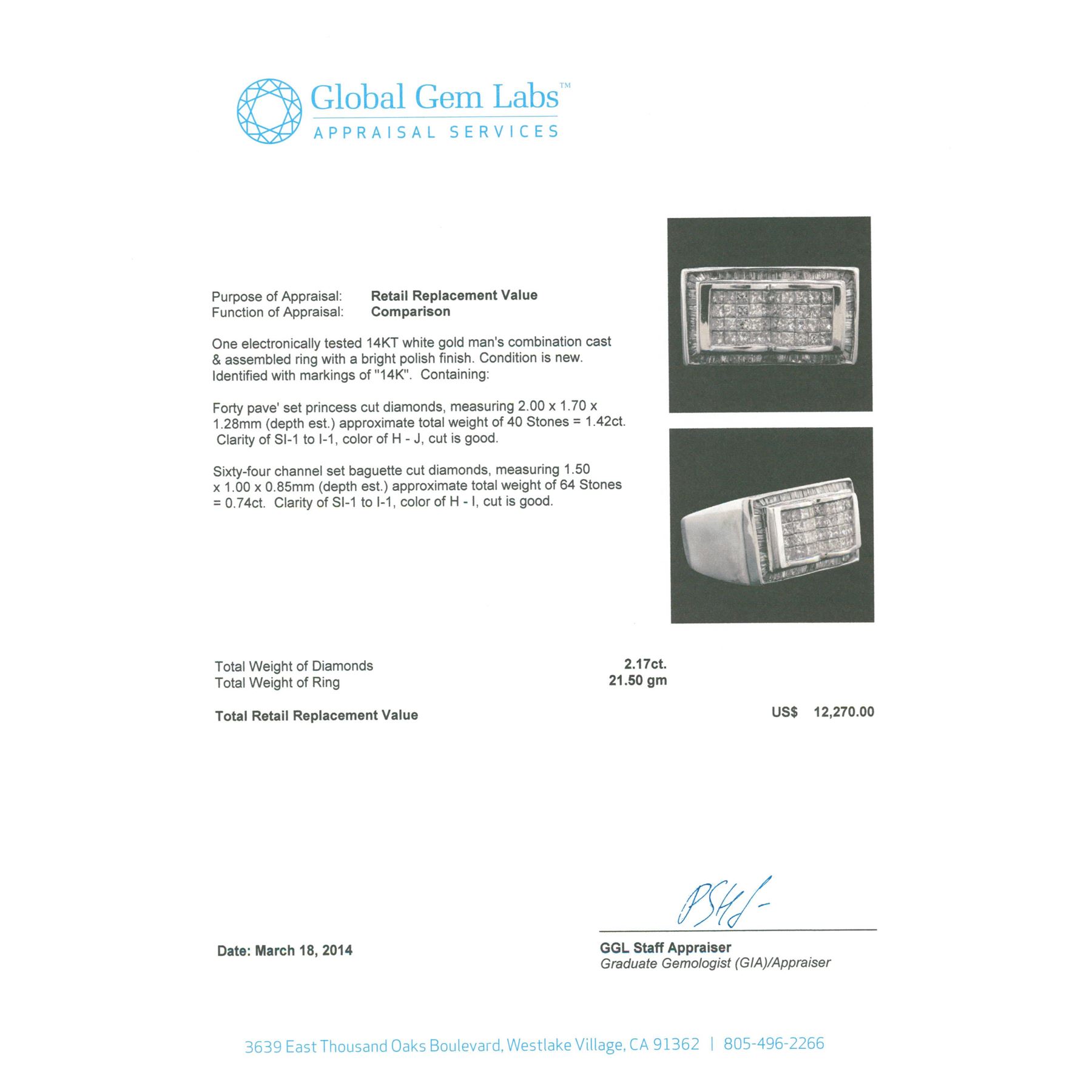 One electronically tested 14KT white gold man's combination cast & assembled ring with a bright polish finish. Condition is new. Identified with markings of "14K". Containing: Forty pave' set princess cut diamonds, measuring 2.00 x 1.70 x 1.28mm (depth est.) approximate. Total Weight of 40 Stones = 1.42ct. Clarity: SI-1 to I-1. Color: H - J, Cut is Good. Sixty-Four channel set baguette cut diamonds, measuring 1.50 x 1.00 x 0.85mm (depth est.) approximate. Total Weight of 64 Stones = 0.74ct. Clarity: SI-1 to I-1. Color: H - I, Cut is Good. Total Weight of Diamonds 2.17ct. Total Weight of Ring 21.50gm. GGL Appraised at $12,270.00.