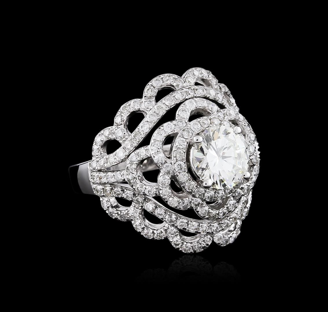 One electronically tested 14KT white gold ladies cast diamond engagement ring with a flat shank with a bright polish finish. Identified with markings of "K14". Condition is new. Containing: One round brilliant cut diamond, measuring 7.00 - 7.05 x 3.96mm exact weight 1.14ct. Clarity of VVS-2, Color of J, Cut is Good. Graded loose prior to setting by GIA Gemological Laboratory Report # 6167924249. One Hundred Sixty-Four prong set round brilliant cut diamonds, measuring 1.20 - 1.20 x 0.72mm (depth est.) approximate total weight of 164 Stones = 1.03ct. Clarity of SI-2 to I-1, Color of H - I. All diamonds are graded in the mounting, unless otherwise stated. Total Weight of Diamonds 2.17ct. Total Weight of Engagement Ring 7.90 grams. GGL Appraised at $16,075.00.