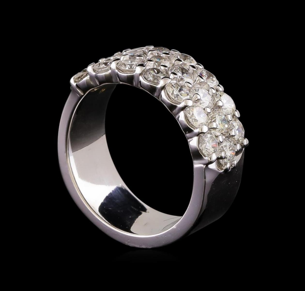 One electronically tested 14KT white gold ladies cast diamond ring with a flat shank with a bright polish finish. Identified with markings of "14K". Condition is new. Containing: Twenty-Two prong set round brilliant cut diamonds, measuring 3.00 - 3.00 x 1.80mm (depth est.) approximate total weight of 22 Stones = 2.17ct. Clarity: SI-2 to I-1. Color: I - J, Cut is Good. All diamonds are graded in the mounting, unless otherwise stated. Total Weight of Diamonds 2.17ct. Total Weight of Ring 9.40 grams. GGL Appraised.