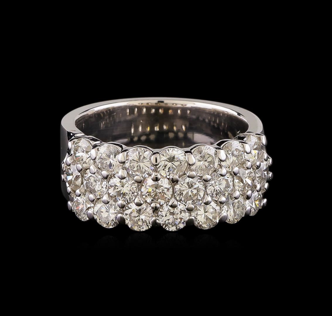 One electronically tested 14KT white gold ladies cast diamond ring with a flat shank with a bright polish finish. Identified with markings of "14K". Condition is new. Containing: Twenty-Two prong set round brilliant cut diamonds, measuring 3.00 - 3.00 x 1.80mm (depth est.) approximate total weight of 22 Stones = 2.17ct. Clarity: SI-2 to I-1. Color: I - J, Cut is Good. All diamonds are graded in the mounting, unless otherwise stated. Total Weight of Diamonds 2.17ct. Total Weight of Ring 9.40 grams. GGL Appraised.