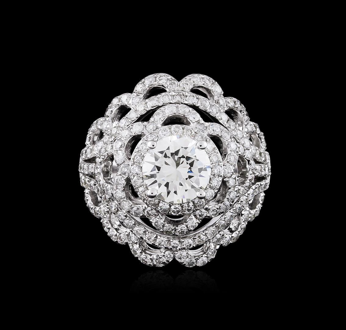 One electronically tested 14KT white gold ladies cast diamond engagement ring with a flat shank with a bright polish finish. Identified with markings of "K14". Condition is new. Containing: One round brilliant cut diamond, measuring 7.00 - 7.05 x 3.96mm exact weight 1.14ct. Clarity of VVS-2, Color of J, Cut is Good. Graded loose prior to setting by GIA Gemological Laboratory Report # 6167924249. One Hundred Sixty-Four prong set round brilliant cut diamonds, measuring 1.20 - 1.20 x 0.72mm (depth est.) approximate total weight of 164 Stones = 1.03ct. Clarity of SI-2 to I-1, Color of H - I. All diamonds are graded in the mounting, unless otherwise stated. Total Weight of Diamonds 2.17ct. Total Weight of Engagement Ring 7.90 grams. GGL Appraised.