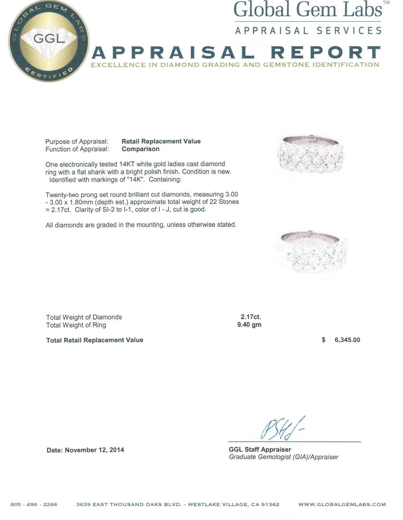One electronically tested 14KT white gold ladies cast diamond ring with a flat shank with a bright polish finish. Identified with markings of "14K". Condition is new. Containing: Twenty-Two prong set round brilliant cut diamonds, measuring 3.00 - 3.00 x 1.80mm (depth est.) approximate total weight of 22 Stones = 2.17ct. Clarity: SI-2 to I-1. Color: I - J, Cut is Good. All diamonds are graded in the mounting, unless otherwise stated. Total Weight of Diamonds 2.17ct. Total Weight of Ring 9.40 grams. GGL Appraised.