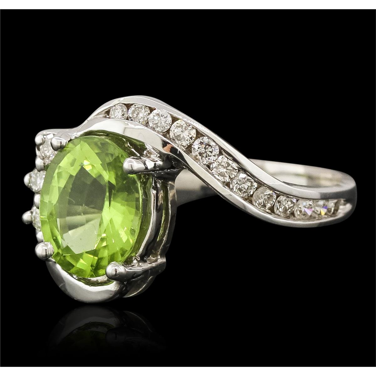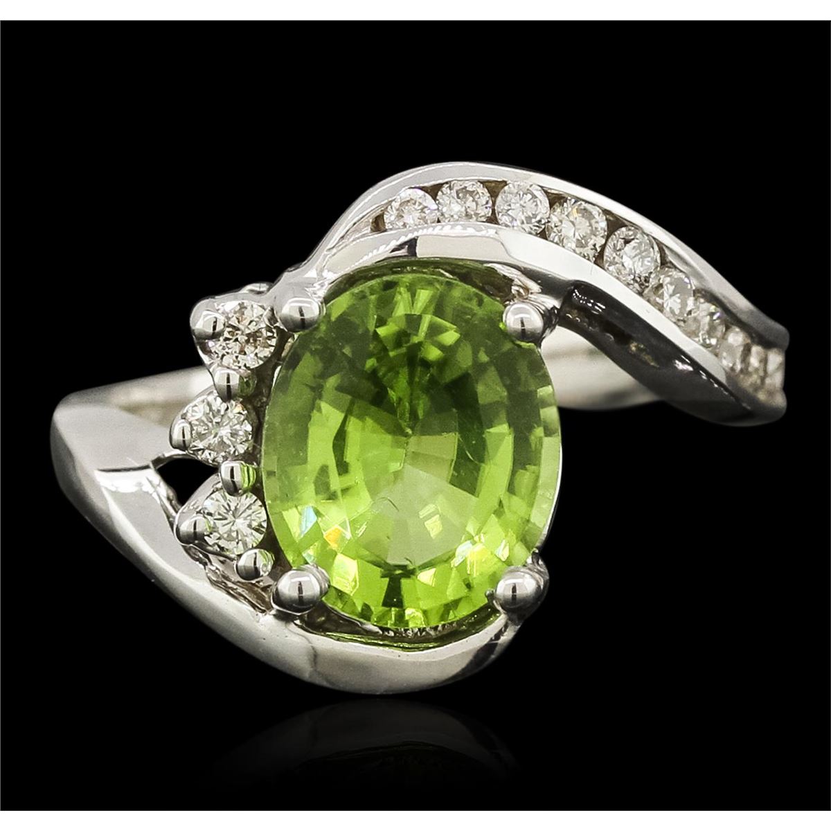 One electronically tested 14KT white gold ladies cast peridot and diamond ring with a bright polish finish. The featured peridot is set within a stylized diamond bypass design, completed by a two and one-half millimeter wide band. Identified with markings of "14K". Condition is new, good workmanship. Containing: One prong set oval mixed cut natural peridot, measuring 8.90 x 7.36 x 4.56mm, 8%. bulge factor, approximate weight of 2.17ct., clarity is eye clean, type II, medium, very slightly grayish, yellowish green color, (GIA yG 5/3), cut is good. Transmitting light with no distortion, transparent. Graded in the setting. Fifteen prong and channel set round brilliant cut diamonds, measuring 1.80 - 1.50 x 0.99mm (depth est.) approximate. Total Weight of 15 Stones = 0.34ct. Graded in the setting. Clarity: SI-1 to I-1. Color: G - I. Total Weight of Colored Stones 2.17ct. Total Weight of Diamonds 0.34ct. Total Weight of Ring 3.55gm. AIG Appraised at $2,250.00.