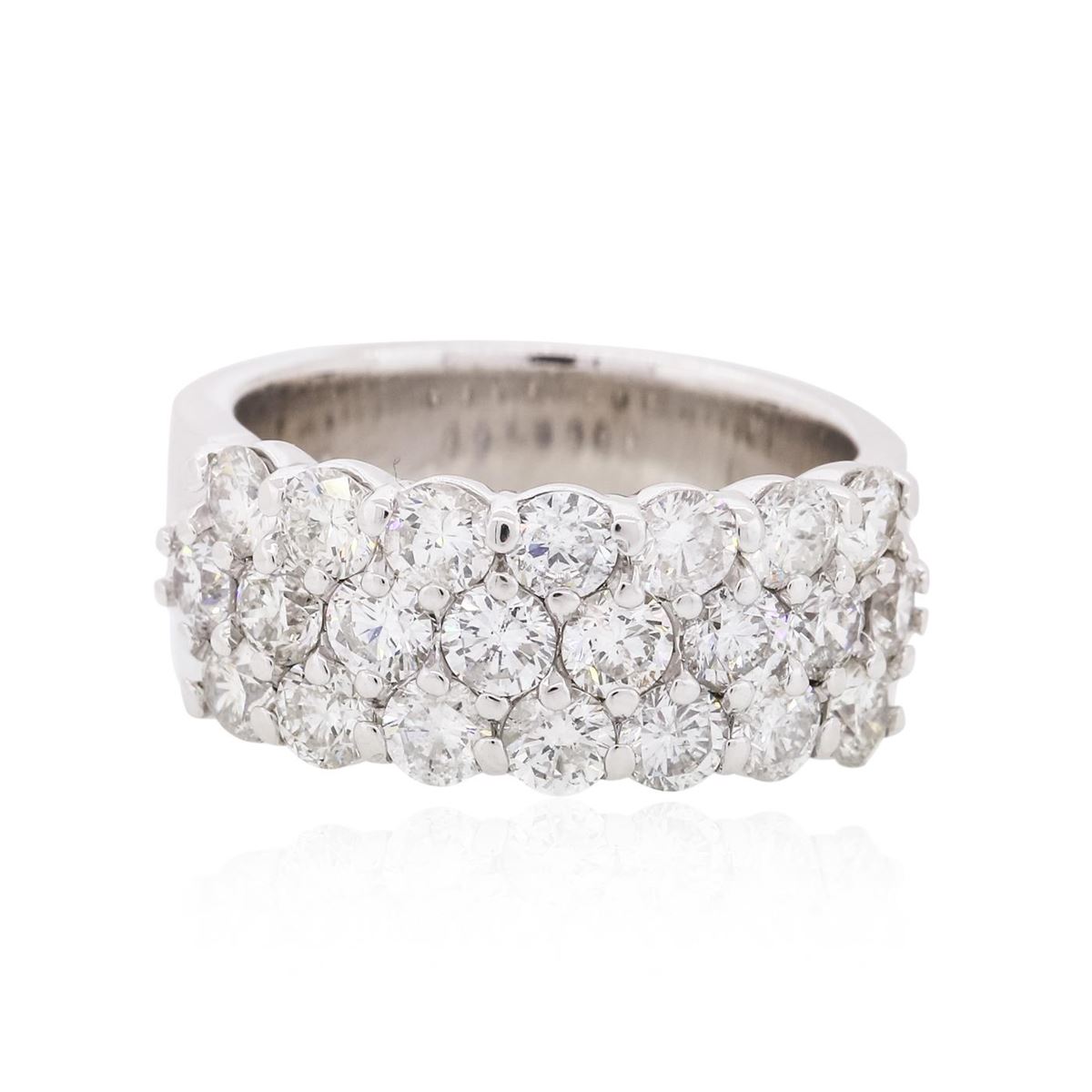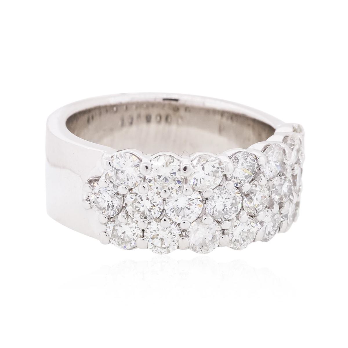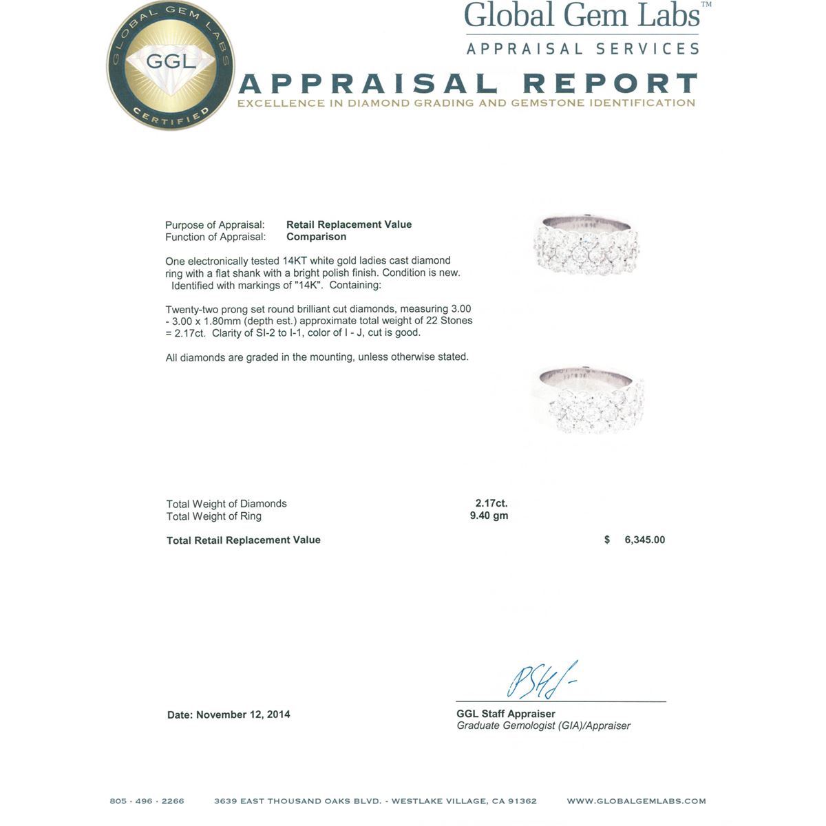 One electronically tested 14KT white gold ladies cast diamond ring with a flat shank with a bright polish finish. Identified with markings of "14K". Condition is new. Containing: Twenty-Two prong set round brilliant cut diamonds, measuring 3.00 - 3.00 x 1.80mm (depth est.) approximate total weight of 22 Stones = 2.17ct. Clarity: SI-2 to I-1. Color: I - J, Cut is Good. All diamonds are graded in the mounting, unless otherwise stated. Total Weight of Diamonds 2.17ct. Total Weight of Ring 9.40 grams. GGL Appraised at $6,345.00.