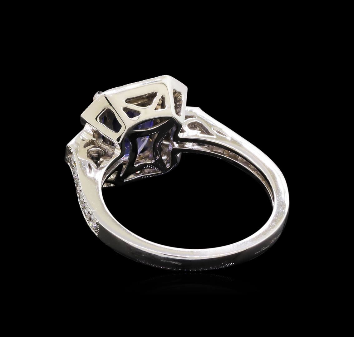 One electronically tested 14KT white gold ladies combination cast & assembled tanzanite and diamond ring with a flat shank with a bright polish finish. Identified with markings of "14K". Condition is new. Containing: One prong set rectangular cushion modified brilliant cut natural tanzanite, measuring 9.05 x 6.88 x 4.45mm, approximate weight of 2.18ct., clarity is eye clean, type I, medium, very slightly grayish, violet color, (GIA V 5/3), cut is good. Twenty-Six prong set round brilliant cut diamonds, measuring 1.50 - 1.50 x 0.90mm (depth est.) approximate total weight of 26 Stones = 0.32ct. Clarity: SI-1 to I-1. Color: I - J, Cut is Good. Four channel set baguette cut (tapered) diamonds, measuring 4.00 x 1.10 x 0.94mm (depth est.) approximate total weight of 4 Stones = 0.15ct. Clarity: VS-2. Color: I, Cut is Good. Colored gemstones are presumed to have been subjected to commonly used enhancement processes. All diamonds and colored gemstones are graded in the mounting, unless otherwise stated. Total Weight of Colored Stones 2.18ct. Total Weight of Diamonds 0.47ct. Total Weight of Ring 4.40 grams. GGL Appraised at $6,215.00.