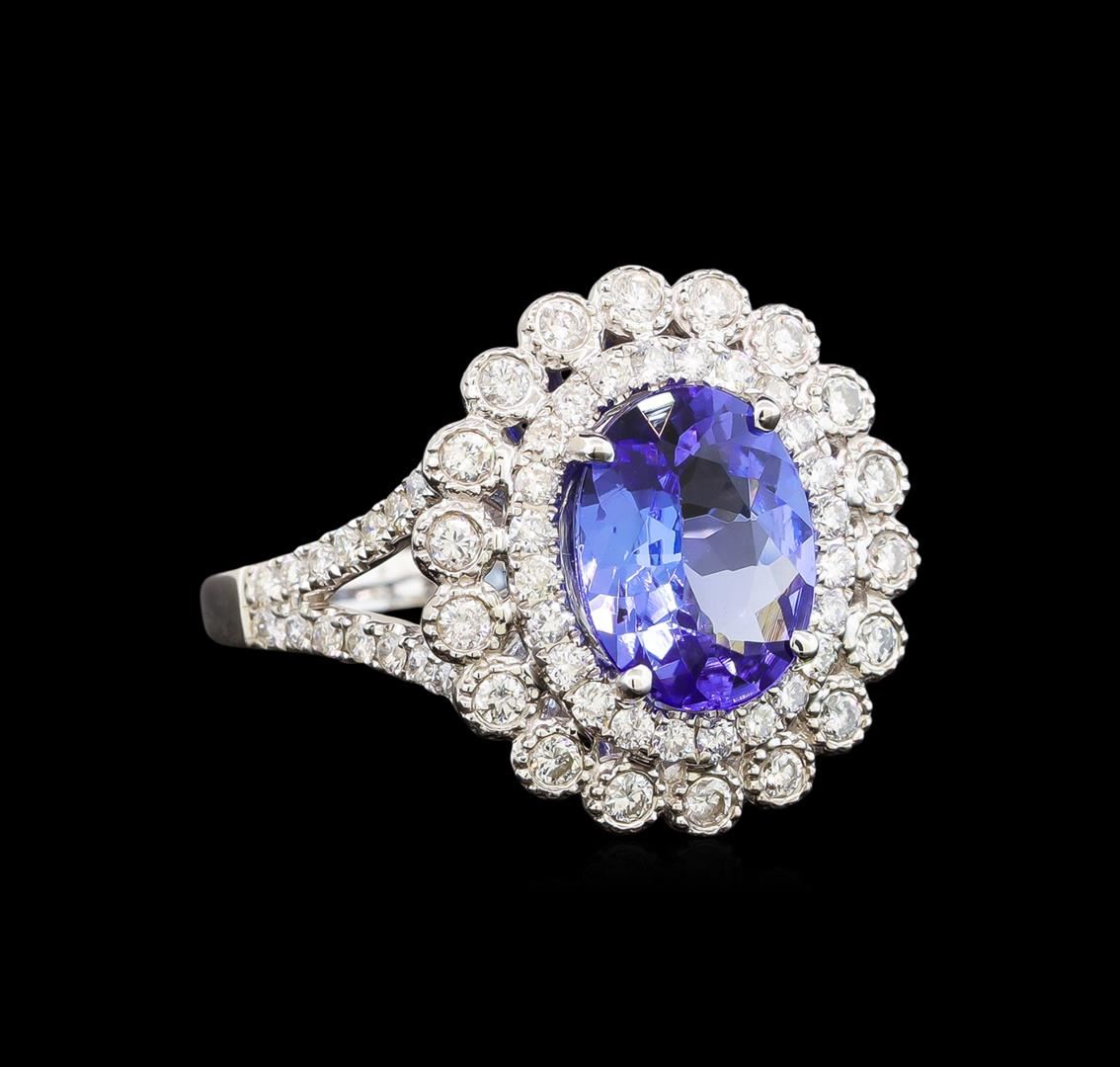 One electronically tested 14KT white gold ladies cast tanzanite and diamond ring with a split shank with a bright polish finish. Trademark is UCG. Identified with markings of "14K 585". Condition is new. Containing: One prong set oval modified brilliant cut natural tanzanite, measuring 10.04 x 7.85 x 3.93mm, approximate weight of 2.18ct., clarity is eye clean, type I, medium light, very slightly grayish, violet color, (GIA V 4/3), cut is good. Eighteen prong set round brilliant cut diamonds, measuring 1.50 - 1.50 x 0.90mm (depth est.) approximate total weight of 18 Stones = 0.22ct. Clarity: SI-2 to I-1. Color: I - J. Fifty-Two prong set round brilliant cut diamonds, measuring 1.30 - 1.30 x 0.78mm (depth est.) approximate total weight of 52 Stones = 0.42ct. Clarity: SI-2 to I-2. Color: I - J. All diamonds and colored gemstones are graded in the mounting, unless otherwise stated. Colored gemstones are presumed to have been subjected to commonly used enhancement processes.. Total Weight of Colored Stones 2.18ct. Total Weight of Diamonds 0.64ct. Total Weight of Ring 5.20 grams. GGL Appraised at $4,430.00.
