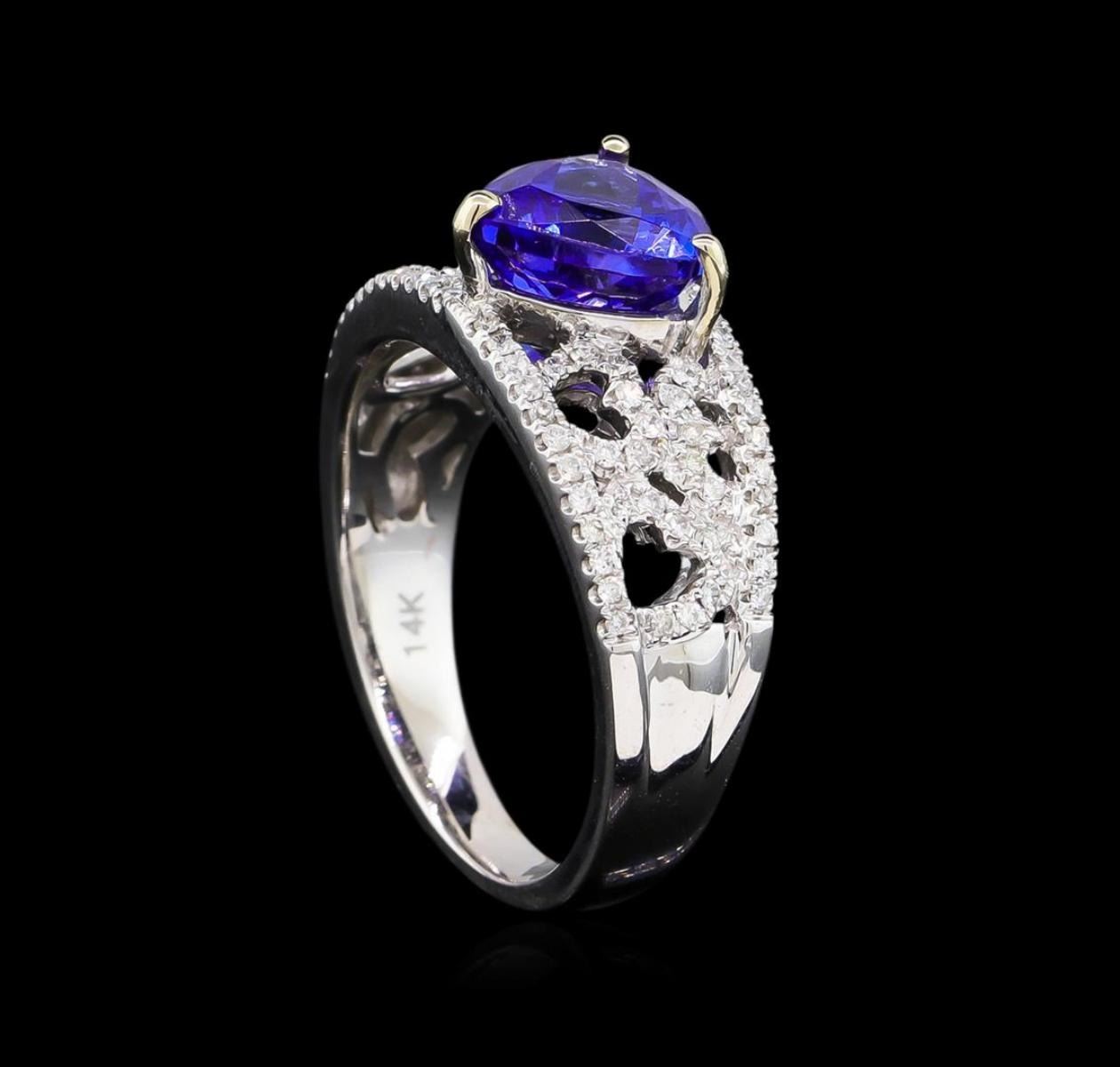 One electronically tested 14KT white gold Ladies combination cast & assembled ring with a bright polish finish. Condition is new. Identified with markings of "14K". Containing: Ninety bead set round brilliant cut diamonds, measuring 0.90 - 0.90 x 0.54mm (depth est.) approximate. Total Weight of 90 Stones = 0.40ct. Clarity: I-1 to I-2. Color: H - I, Cut is Good. One prong set pear modified mixed cut natural tanzanite, measuring 8.00 x 8.00 x 5.20mm, approximate weight of 2.18ct., clarity is eye clean, medium, moderately strong, violetish blue color, (GIA vB 5/4), cut is good. Colored gemstones are presumed to have been subjected to commonly used color/clarity enhancement processes. Total Weight of Colored Stones 2.18ct. Total Weight of Diamonds 0.40ct. Total Weight of Ring 5.40 grams. GGL Appraised.