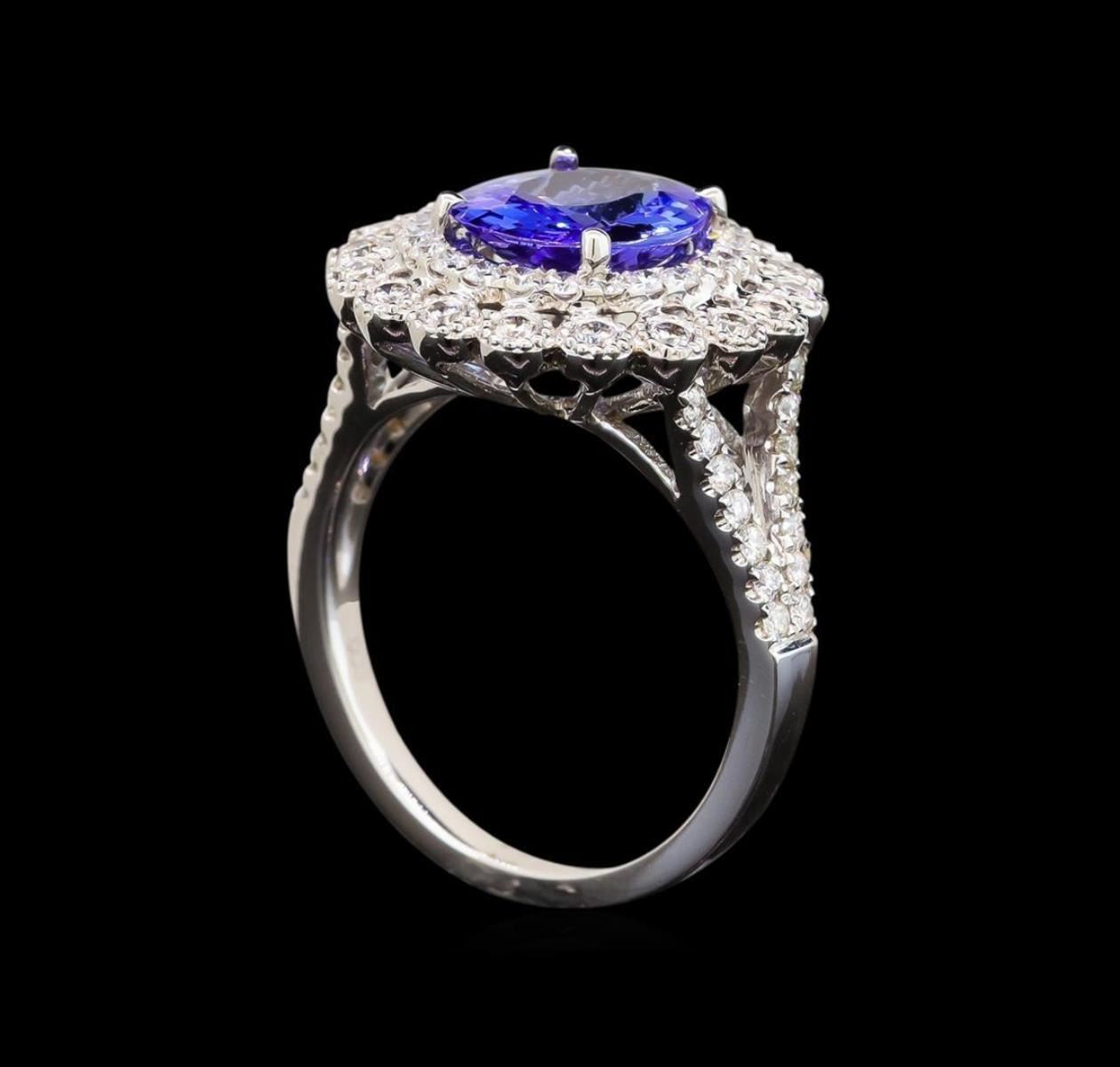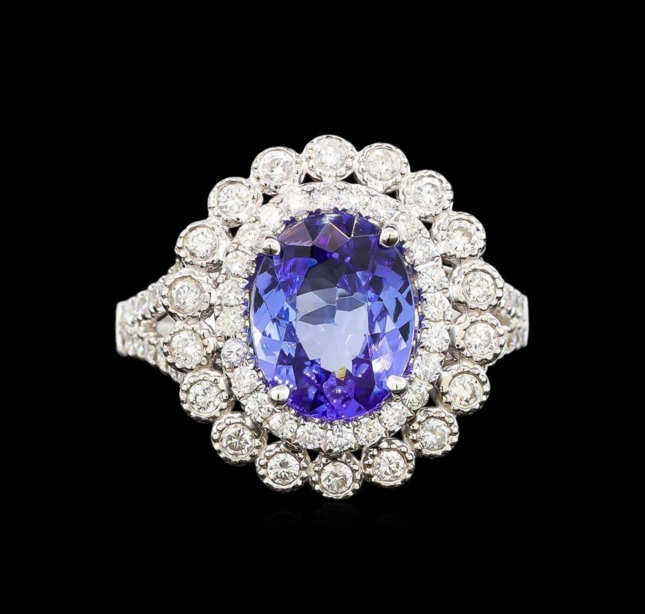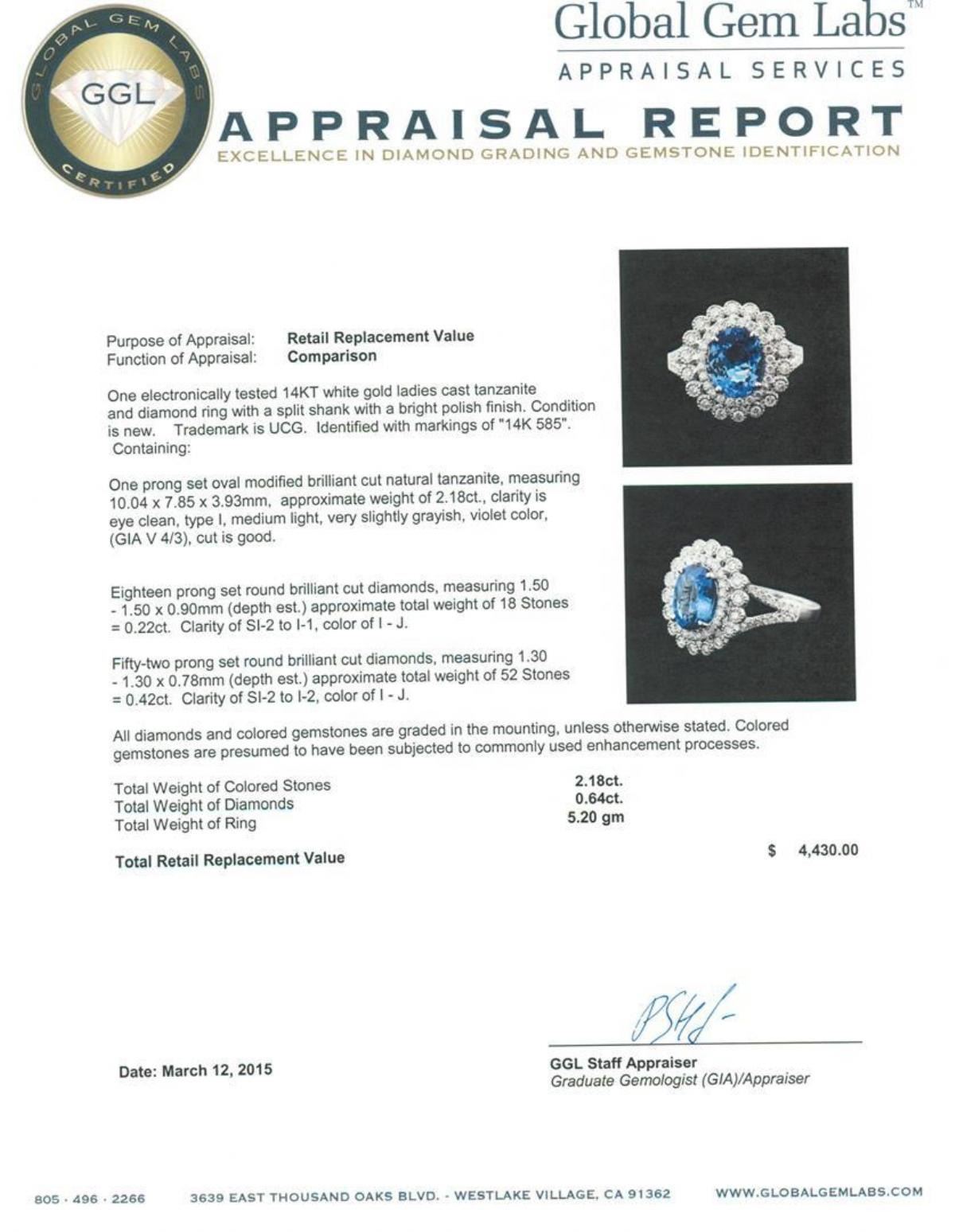 One electronically tested 14KT white gold ladies cast tanzanite and diamond ring with a split shank with a bright polish finish. Trademark is UCG. Identified with markings of "14K 585". Condition is new. Containing: One prong set oval modified brilliant cut natural tanzanite, measuring 10.04 x 7.85 x 3.93mm, approximate weight of 2.18ct., clarity is eye clean, type I, medium light, very slightly grayish, violet color, (GIA V 4/3), cut is good. Eighteen prong set round brilliant cut diamonds, measuring 1.50 - 1.50 x 0.90mm (depth est.) approximate total weight of 18 Stones = 0.22ct. Clarity: SI-2 to I-1. Color: I - J. Fifty-Two prong set round brilliant cut diamonds, measuring 1.30 - 1.30 x 0.78mm (depth est.) approximate total weight of 52 Stones = 0.42ct. Clarity: SI-2 to I-2. Color: I - J. All diamonds and colored gemstones are graded in the mounting, unless otherwise stated. Colored gemstones are presumed to have been subjected to commonly used enhancement processes.. Total Weight of Colored Stones 2.18ct. Total Weight of Diamonds 0.64ct. Total Weight of Ring 5.20 grams. GGL Appraised.
