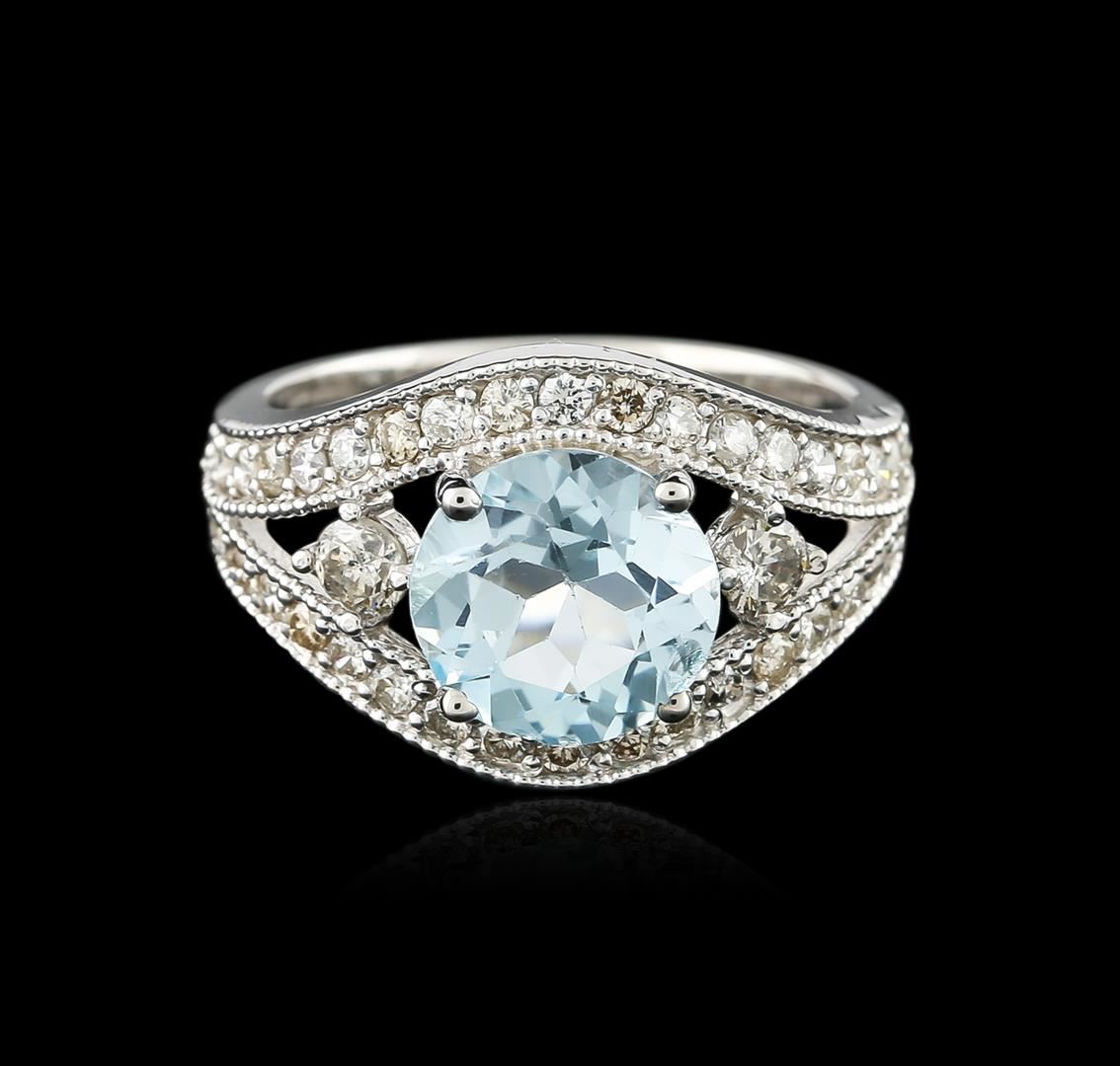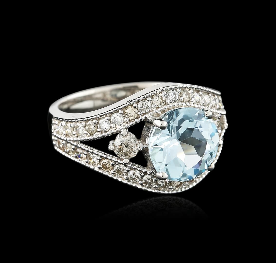One electronically tested 14KT white gold ladies cast topaz and diamond ring with a split shoulder shank with a bright polish finish. Identified with markings of "K14". Condition is new. Containing: One prong set round modified brilliant cut natural blue topaz, measuring 8.94 - 8.86 x 5.01 mm, approximate weight of 2.18ct., clarity is eye clean, type I, light, slightly grayish, blue color, (GIA B 3/2), cut is good. Two prong set round brilliant cut diamonds, measuring 3.00 - 3.00 x 1.80mm (depth est.) approximate total weight of 2 Stones = 0.20ct. Clarity: I-2. Color: J - K, Cut is Good. Thirty-Eight prong set round brilliant cut diamonds, measuring 1.30 - 1.30 x 0.78mm (depth est.) approximate total weight of 38 Stones = 0.30ct. Clarity: SI-2 to I-2. Color: J - K, Cut is Good. Diamonds and colored gemstones are graded in the mounting, unless otherwise stated. Colored gemstones are presumed to have been subjected to commonly used enhancement processes. Total Weight of Colored Stones 2.18ct. Total Weight of Diamonds 0.50ct. Total Weight of Ring 5.80 grams. GGL Appraised at $1,650.00.