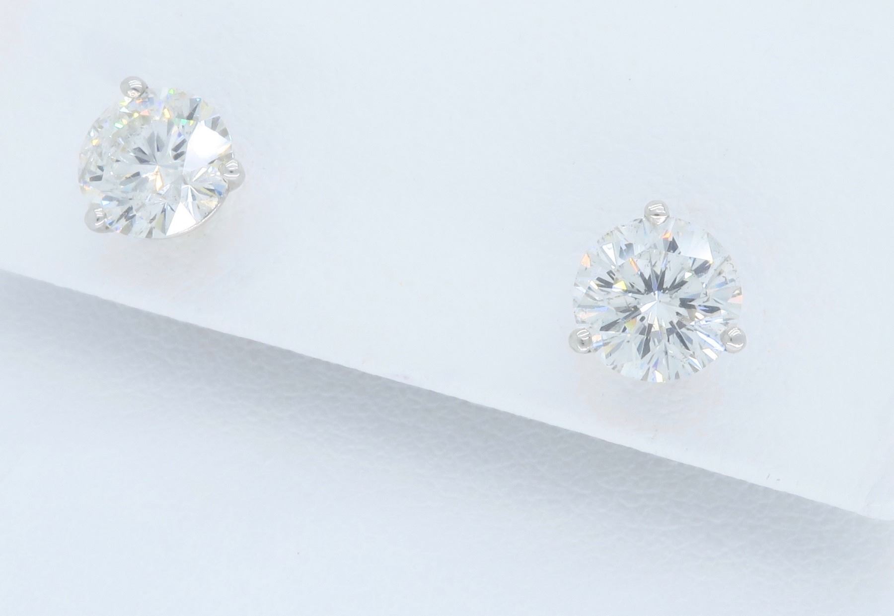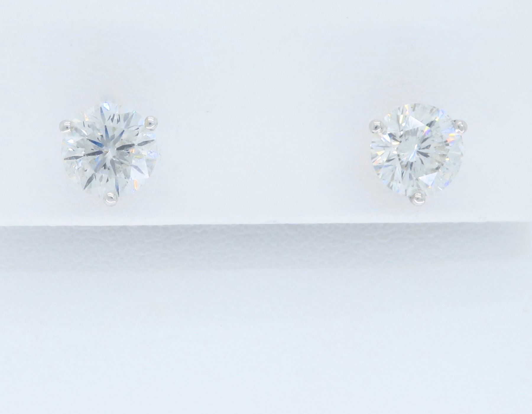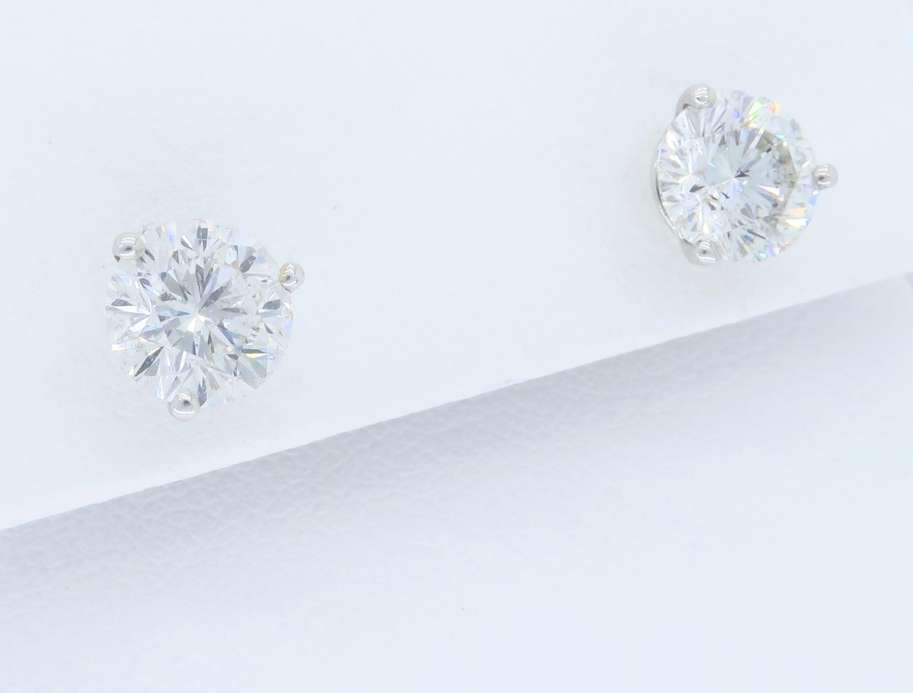 One 14KT White Gold 2.18ctw Leo Diamond Earrings. Leo Diamond earrings feature one 1.10CT Round Leo Diamond with G-H color and SI1-SI2 clarity, the diamond is laser-scribed with �LEO 163386� the IGI Certification # is 32542951. While the other earring features a 1.08CT Round Leo Diamond with H color and SI2 clarity, this diamond is laser-scribed with �LEO 208166� the GSI Certification # is 60374300103. There is 2.18CTW of Diamonds in this stunning pair of earrings. Total weight of these earrings is 8.1 grams.