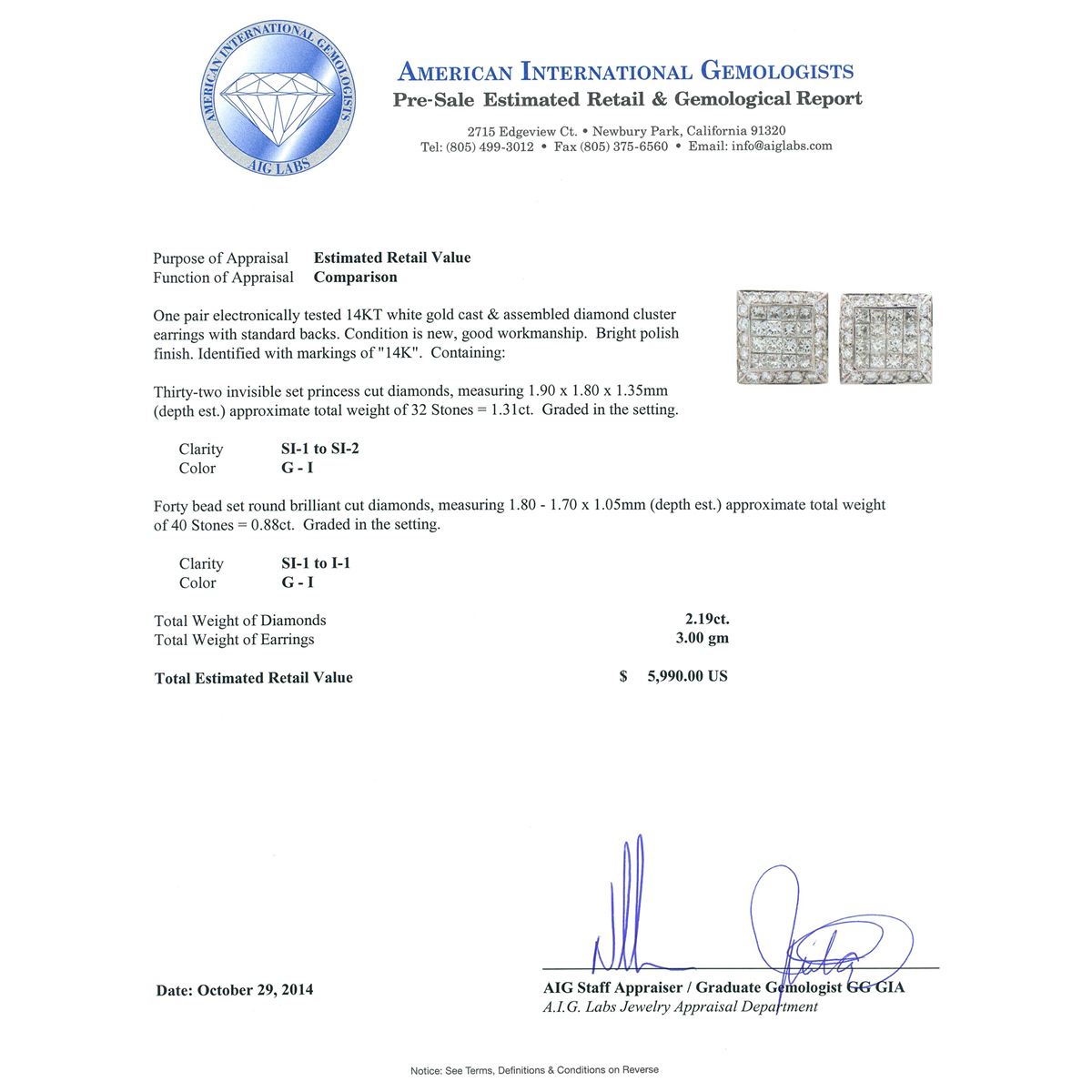 One pair electronically tested 14KT white gold cast & assembled diamond cluster earrings with standard backs. Bright polish finish. Identified with markings of "14K". Condition is new, good workmanship. Containing: Thirty-Two invisible set princess cut diamonds, measuring 1.90 x 1.80 x 1.35mm (depth est.) approximate total weight of 32 Stones = 1.31ct. Graded in the setting. Clarity: SI-1 to SI-2. Color: G - I Forty bead set round brilliant cut diamonds, measuring 1.80 - 1.70 x 1.05mm (depth est.) approximate total weight of 40 Stones = 0.88ct. Graded in the setting. Clarity: SI-1 to I-1. Color: G - I. Total Weight of Diamonds 2.19ct. Total Weight of Earrings 3.00 grams. AIG Appraised at $5,990.00.