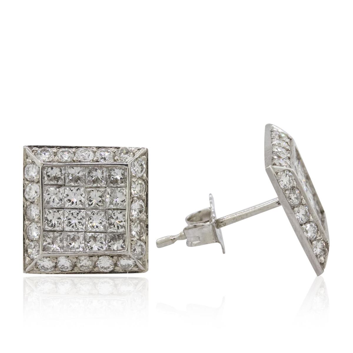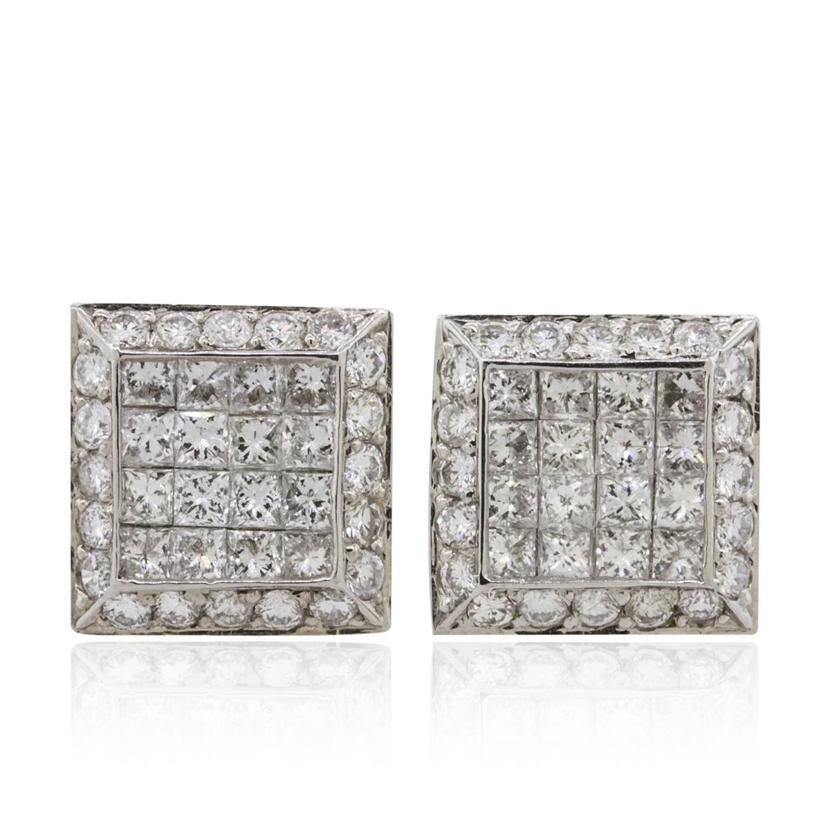 One pair electronically tested 14KT white gold cast & assembled diamond cluster earrings with standard backs. Bright polish finish. Identified with markings of "14K". Condition is new, good workmanship. Containing: Thirty-Two invisible set princess cut diamonds, measuring 1.90 x 1.80 x 1.35mm (depth est.) approximate total weight of 32 Stones = 1.31ct. Graded in the setting. Clarity: SI-1 to SI-2. Color: G - I Forty bead set round brilliant cut diamonds, measuring 1.80 - 1.70 x 1.05mm (depth est.) approximate total weight of 40 Stones = 0.88ct. Graded in the setting. Clarity: SI-1 to I-1. Color: G - I. Total Weight of Diamonds 2.19ct. Total Weight of Earrings 3.00 grams. AIG Appraised at $5,990.00.