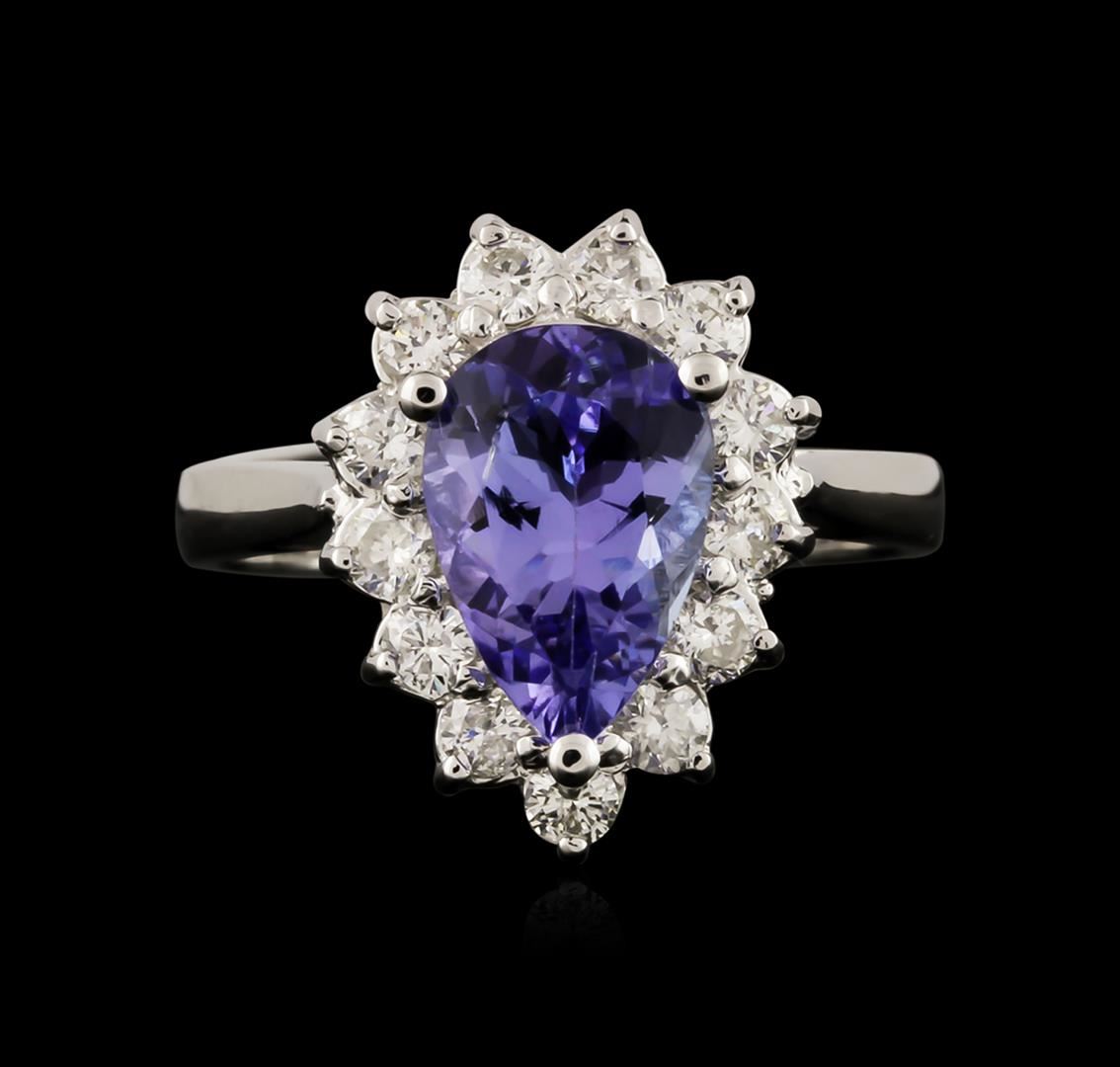 One electronically tested 14KT white gold ladies cast tanzanite and diamond ring with a bright polish finish. Identified with markings of "K14". Condition is new. Containing: One prong set pear modified brilliant cut natural tanzanite, measuring 10.90 x 6.80 x 4.42mm, approximate weight of 2.19ct., clarity is eye clean, type I, medium light, very slightly grayish, violet color, (GIA V 4/3), cut is good. Thirteen prong set round brilliant cut diamonds, measuring 2.10 - 2.10 x 1.26mm (depth est.) approximate total weight of 13 Stones = 0.44ct. Clarity: SI-1 to I-1. Color: H - I, Cut is Good. Colored gemstones are presumed to have been subjected to commonly used enhancement processes. All diamonds and colored gemstones are graded in the mounting, unless otherwise stated. Total Weight of Colored Stones 2.19ct. Total Weight of Diamonds 0.44ct. Total Weight of Ring 4.50 grams. GGL Appraised at $3,550.00.