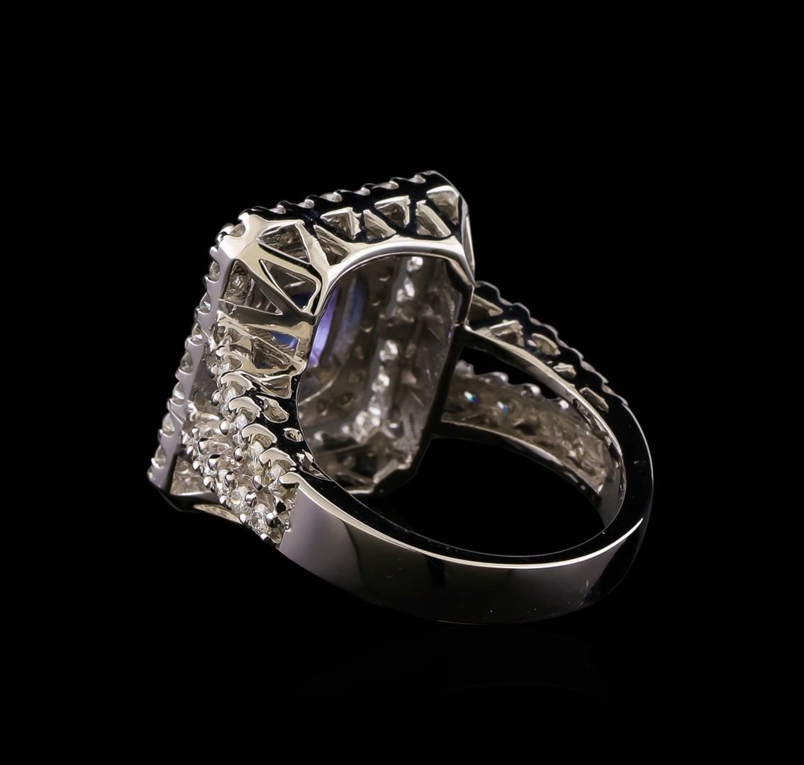 One electronically tested 14KT white gold ladies combination cast & assembled tanzanite and diamond ring with a bright polish finish. Identified with markings of "14K". Condition is new. Containing: One prong set rectangular cushion modified brilliant cut natural tanzanite, measuring 9.00 x 6.89 x 4.48mm, approximate weight of 2.19ct., clarity is eye clean, type I, medium light, very slightly grayish, violet color, (GIA V 4/3), cut is good. Seventy-Six prong set round brilliant cut diamonds, measuring 1.80 - 1.50 x 0.99mm (depth est.) approximate total weight of 76 Stones = 1.25ct. Clarity: SI-2 to I-1. Color: I - J, Cut is Good. Colored gemstones are presumed to have been subjected to commonly used enhancement processes. All diamonds and colored gemstones are graded in the mounting, unless otherwise stated. Total Weight of Colored Stones 2.19ct. Total Weight of Diamonds 1.25ct. Total Weight of Ring 8.80 grams. GGL Appraised at $6,185.00.
