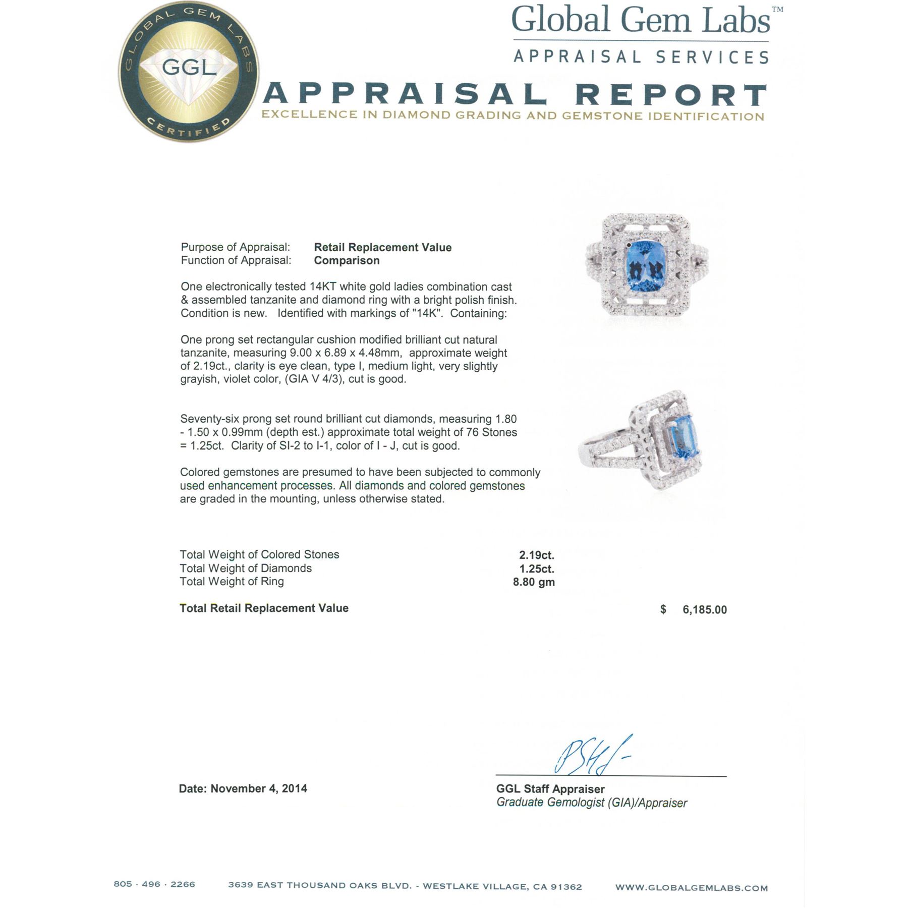 One electronically tested 14KT white gold ladies combination cast & assembled tanzanite and diamond ring with a bright polish finish. Identified with markings of "14K". Condition is new. Containing: One prong set rectangular cushion modified brilliant cut natural tanzanite, measuring 9.00 x 6.89 x 4.48mm, approximate weight of 2.19ct., clarity is eye clean, type I, medium light, very slightly grayish, violet color, (GIA V 4/3), cut is good. Seventy-Six prong set round brilliant cut diamonds, measuring 1.80 - 1.50 x 0.99mm (depth est.) approximate total weight of 76 Stones = 1.25ct. Clarity: SI-2 to I-1. Color: I - J, Cut is Good. Colored gemstones are presumed to have been subjected to commonly used enhancement processes. All diamonds and colored gemstones are graded in the mounting, unless otherwise stated. Total Weight of Colored Stones 2.19ct. Total Weight of Diamonds 1.25ct. Total Weight of Ring 8.80 grams. GGL Appraised at $6,185.00.