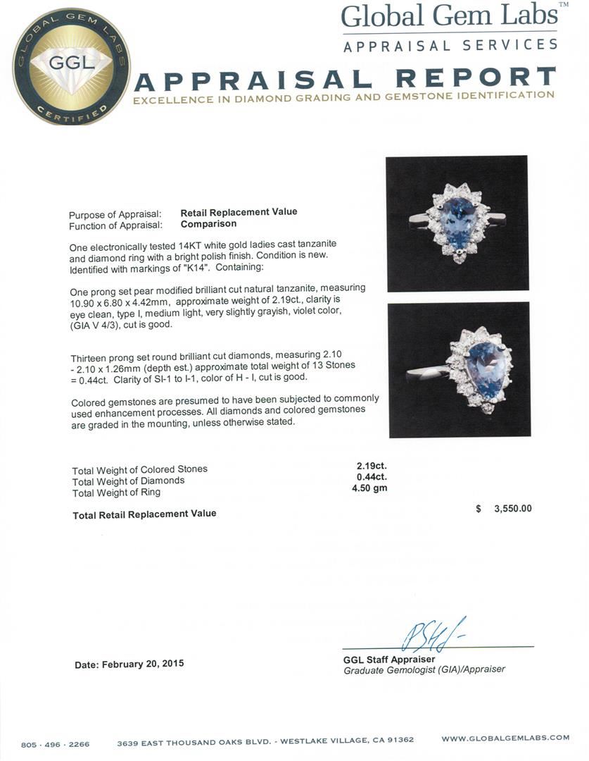 One electronically tested 14KT white gold ladies cast tanzanite and diamond ring with a bright polish finish. Identified with markings of "K14". Condition is new. Containing: One prong set pear modified brilliant cut natural tanzanite, measuring 10.90 x 6.80 x 4.42mm, approximate weight of 2.19ct., clarity is eye clean, type I, medium light, very slightly grayish, violet color, (GIA V 4/3), cut is good. Thirteen prong set round brilliant cut diamonds, measuring 2.10 - 2.10 x 1.26mm (depth est.) approximate total weight of 13 Stones = 0.44ct. Clarity: SI-1 to I-1. Color: H - I, Cut is Good. Colored gemstones are presumed to have been subjected to commonly used enhancement processes. All diamonds and colored gemstones are graded in the mounting, unless otherwise stated. Total Weight of Colored Stones 2.19ct. Total Weight of Diamonds 0.44ct. Total Weight of Ring 4.50 grams. GGL Appraised at $3,550.00.
