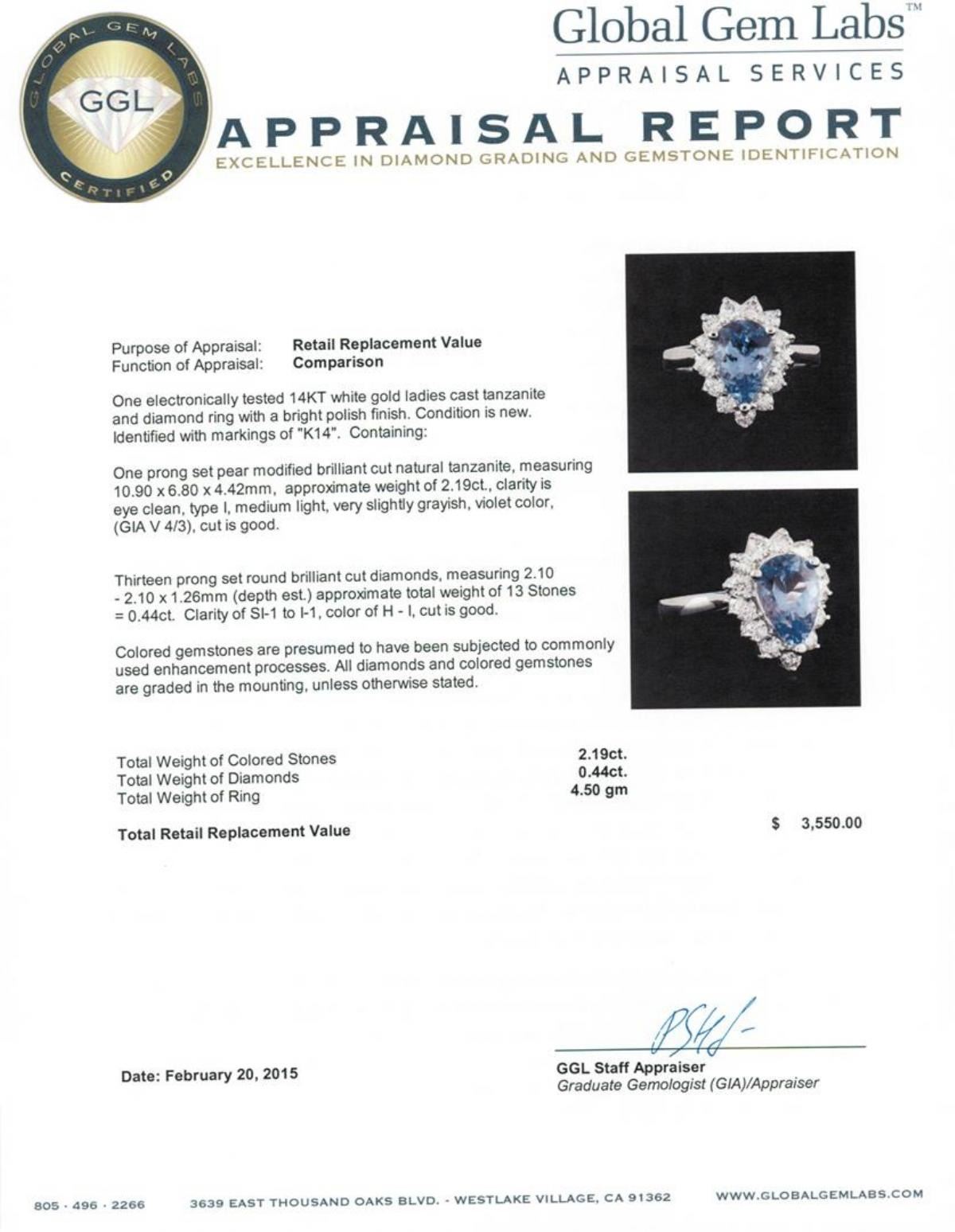 One electronically tested 14KT white gold ladies cast tanzanite and diamond ring with a bright polish finish. Identified with markings of "K14". Condition is new. Containing: One prong set pear modified brilliant cut natural tanzanite, measuring 10.90 x 6.80 x 4.42mm, approximate weight of 2.19ct., clarity is eye clean, type I, medium light, very slightly grayish, violet color, (GIA V 4/3), cut is good. Thirteen prong set round brilliant cut diamonds, measuring 2.10 - 2.10 x 1.26mm (depth est.) approximate total weight of 13 Stones = 0.44ct. Clarity: SI-1 to I-1. Color: H - I, Cut is Good. Colored gemstones are presumed to have been subjected to commonly used enhancement processes. All diamonds and colored gemstones are graded in the mounting, unless otherwise stated. Total Weight of Colored Stones 2.19ct. Total Weight of Diamonds 0.44ct. Total Weight of Ring 4.50 grams. GGL Appraised.