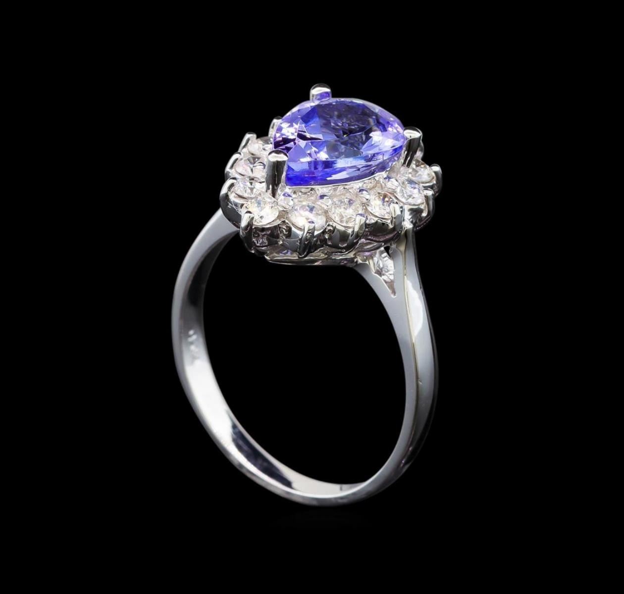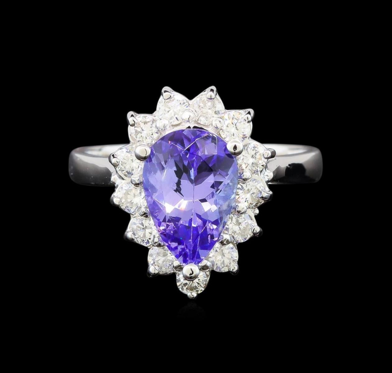 One electronically tested 14KT white gold ladies cast tanzanite and diamond ring with a bright polish finish. Identified with markings of "K14". Condition is new. Containing: One prong set pear modified brilliant cut natural tanzanite, measuring 10.90 x 6.80 x 4.42mm, approximate weight of 2.19ct., clarity is eye clean, type I, medium light, very slightly grayish, violet color, (GIA V 4/3), cut is good. Thirteen prong set round brilliant cut diamonds, measuring 2.10 - 2.10 x 1.26mm (depth est.) approximate total weight of 13 Stones = 0.44ct. Clarity: SI-1 to I-1. Color: H - I, Cut is Good. Colored gemstones are presumed to have been subjected to commonly used enhancement processes. All diamonds and colored gemstones are graded in the mounting, unless otherwise stated. Total Weight of Colored Stones 2.19ct. Total Weight of Diamonds 0.44ct. Total Weight of Ring 4.50 grams. GGL Appraised.