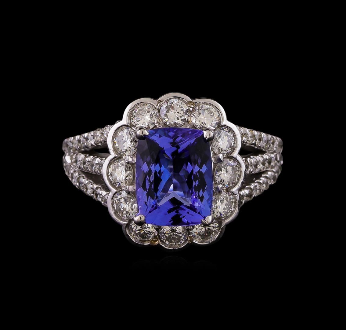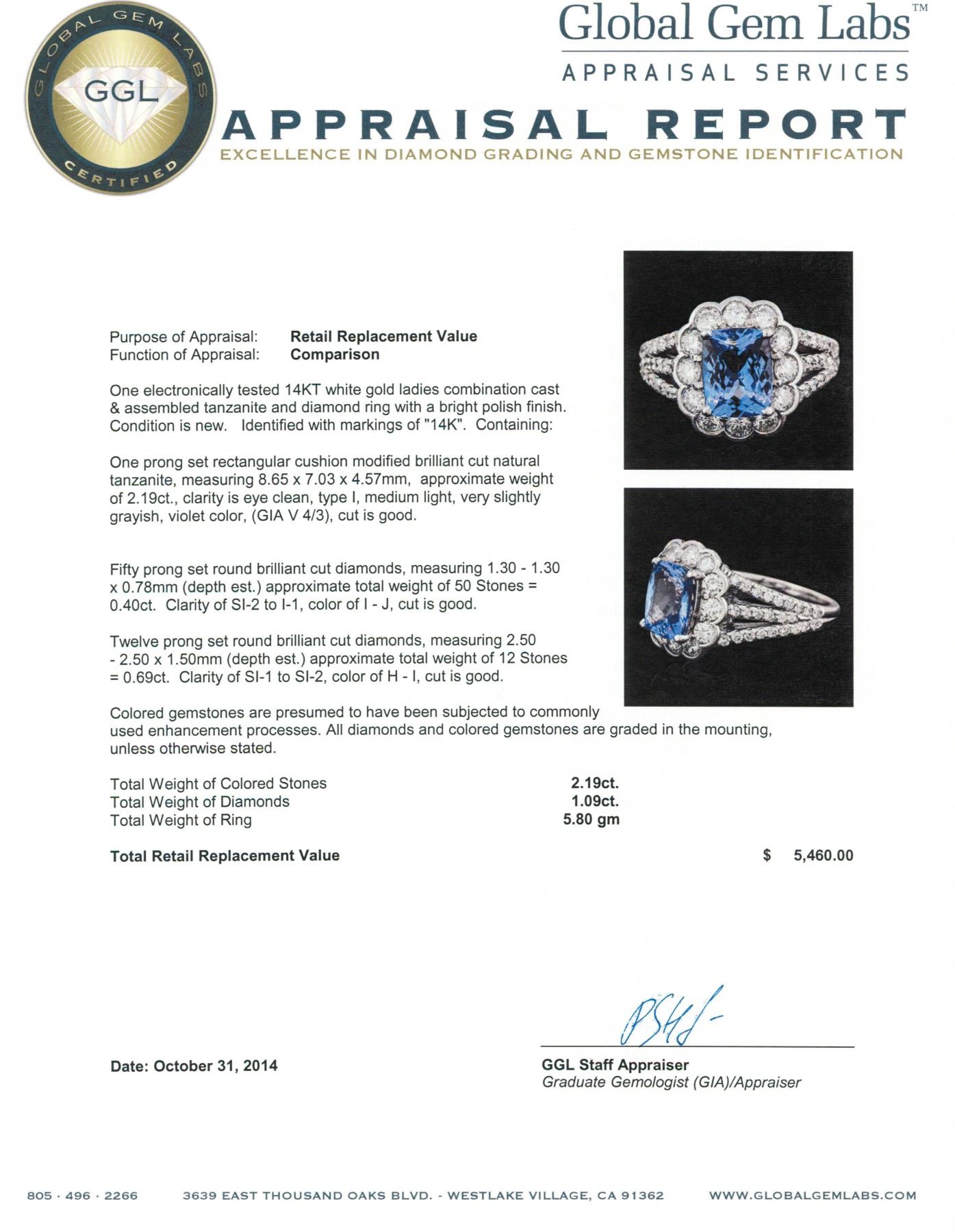 One electronically tested 14KT white gold ladies combination cast & assembled tanzanite and diamond ring with a bright polish finish. Identified with markings of "14K". Condition is new. Containing: One prong set rectangular cushion modified brilliant cut natural tanzanite, measuring 8.65 x 7.03 x 4.57mm, approximate weight of 2.19ct., clarity is eye clean, type I, medium light, very slightly grayish, violet color, (GIA V 4/3), cut is good. Fifty prong set round brilliant cut diamonds, measuring 1.30 - 1.30 x 0.78mm (depth est.) approximate total weight of 50 Stones = 0.40 ct. Clarity: SI-2 to I-1. Color: I - J, Cut is Good. Twelve prong set round brilliant cut diamonds, measuring 2.50 - 2.50 x 1.50mm (depth est.) approximate total weight of 12 Stones = 0.69ct. Clarity: SI-1 to SI-2. Color: H - I, Cut is Good. Colored gemstones are presumed to have been subjected to commonly used enhancement processes. All diamonds and colored gemstones are graded in the mounting, unless otherwise stated. Total Weight of Colored Stones 2.19ct. Total Weight of Diamonds 1.09ct. Total Weight of Ring 5.80 grams. GGL Appraised.