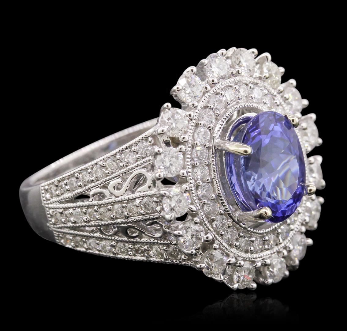 One electronically tested 14KT white gold Ladies combination cast & assembled ring with a bright polish finish. Condition is new. Identified with markings of "14K". Containing: One prong set oval modified brilliant cut natural tanzanite, measuring 8.00 x 6.00 x 3.90mm, approximate weight of 2.20ct., clarity is eye clean, type I, medium, very slightly grayish, violet color, (GIA V 5/3), cut is very good. Colored gemstones are presumed to have been subjected to commonly used color/clarity enhancement processes. Eighty-Eight prong set round brilliant cut diamonds, measuring 2.00 - 1.30 x 0.99mm (depth est.) approximate. Total Weight of 88 Stones = 1.29ct. Clarity: I-1 to I-2. Color: I - J, Cut is Good. Total Weight of Colored Stones 2.20ct. Total Weight of Diamonds 1.29ct. Total Weight of Ring 7.40 grams. GGL Appraised at $7,770.00.