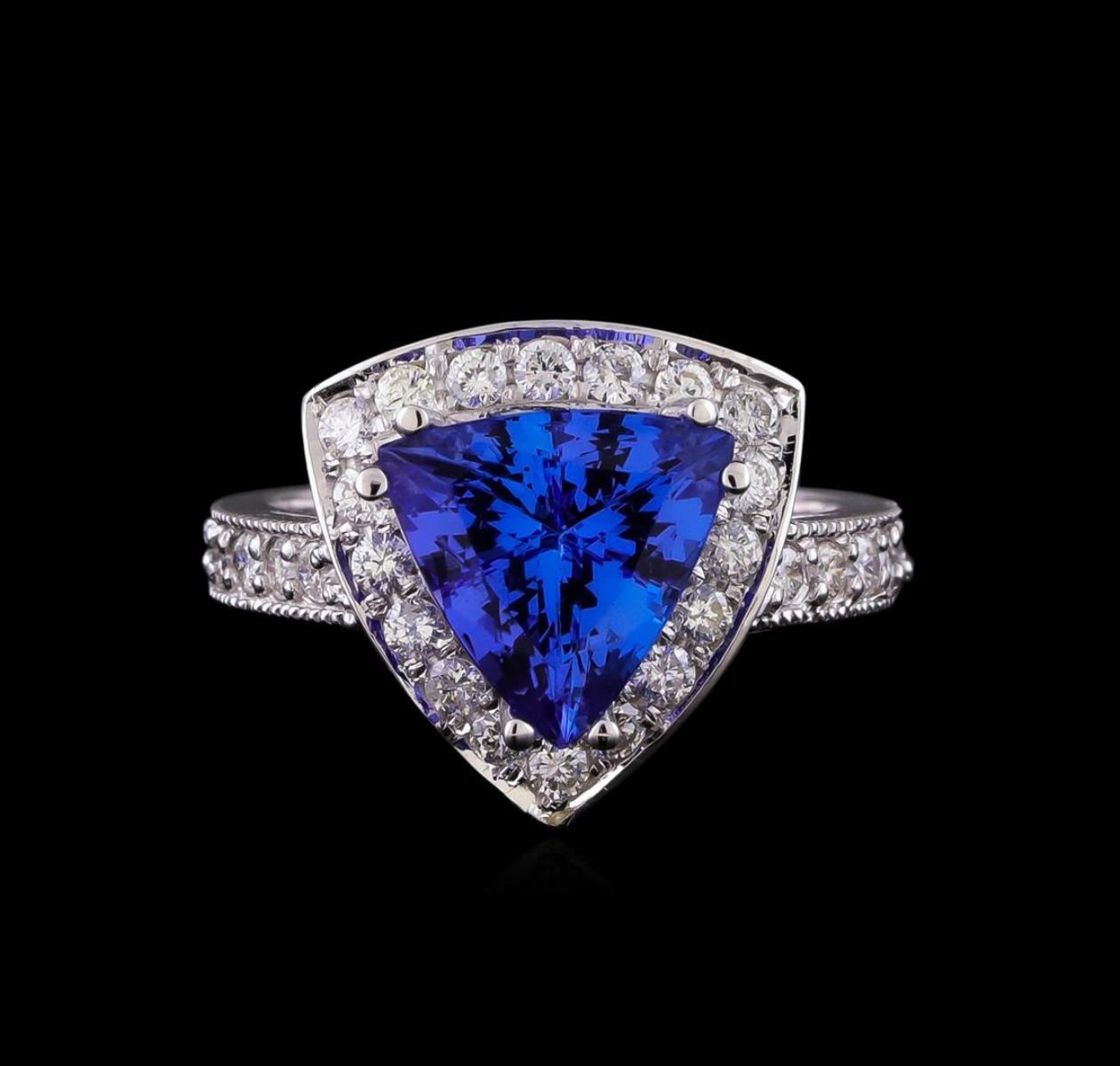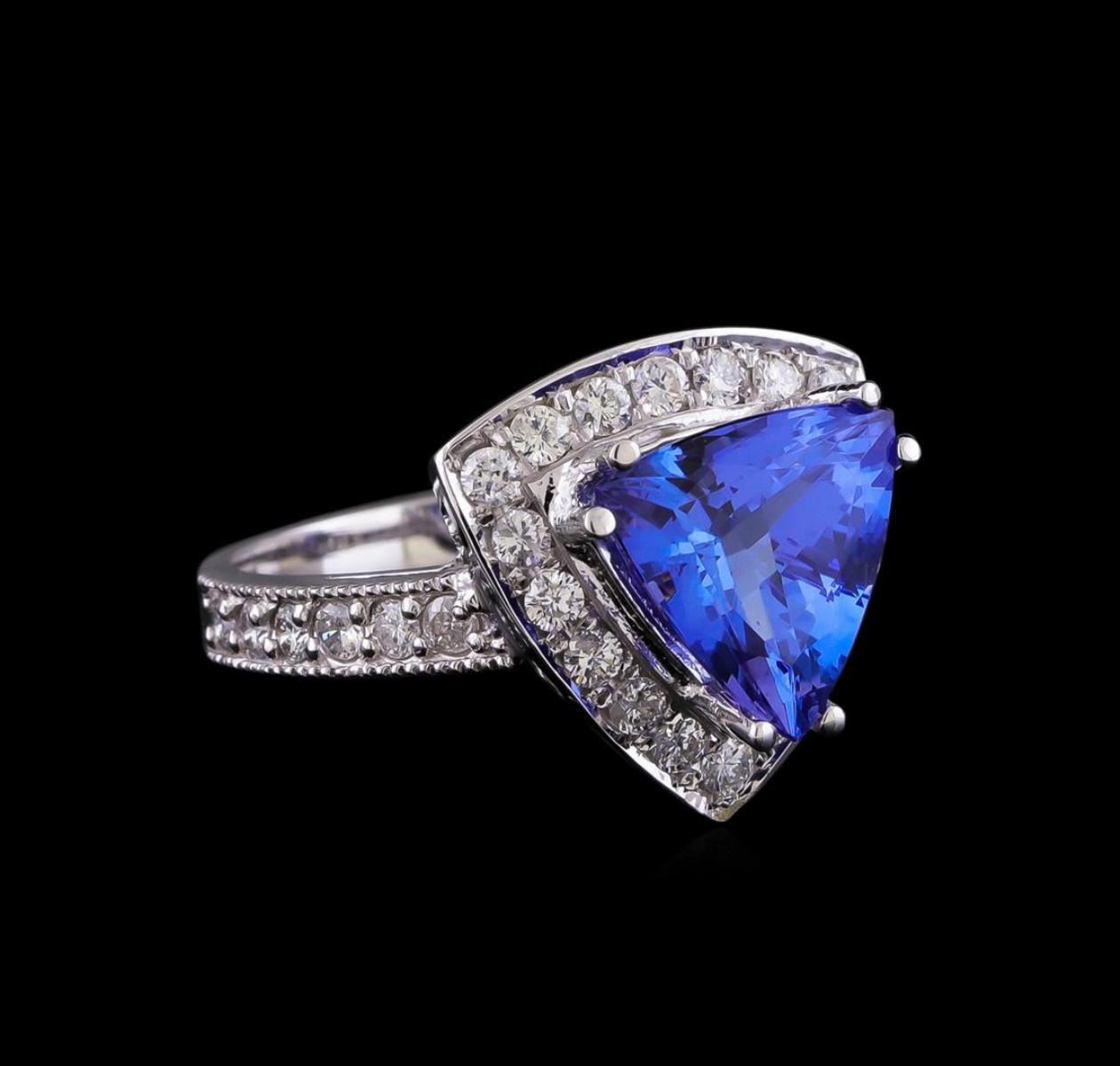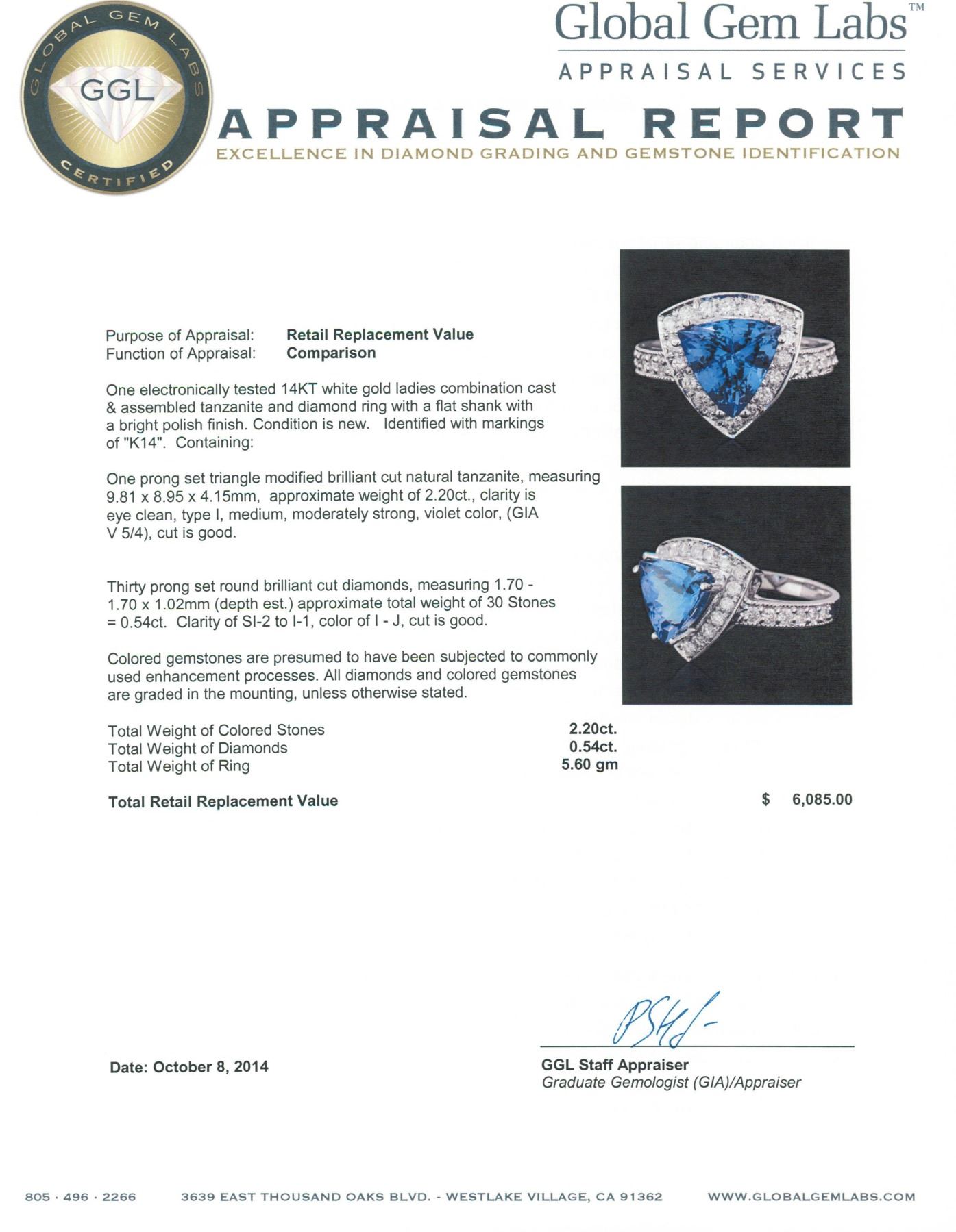 One electronically tested 14KT white gold ladies combination cast & assembled tanzanite and diamond ring with a flat shank with a bright polish finish. Identified with markings of "K14". Condition is new. Containing: One prong set triangle modified brilliant cut natural tanzanite, measuring 9.81 x 8.95 x 4.15mm, approximate weight of 2.20ct., clarity is eye clean, type I, medium, moderately strong, violet color, (GIA V 5/4), cut is good. Thirty prong set round brilliant cut diamonds, measuring 1.70 - 1.70 x 1.02mm (depth est.) approximate total weight of 30 Stones = 0.54ct. Clarity: SI-2 to I-1. Color: I - J, Cut is Good. Colored gemstones are presumed to have been subjected to commonly used enhancement processes. All diamonds and colored gemstones are graded in the mounting, unless otherwise stated. Total Weight of Colored Stones 2.20ct. Total Weight of Diamonds 0.54ct. Total Weight of Ring 5.60 grams. GGL Appraised.