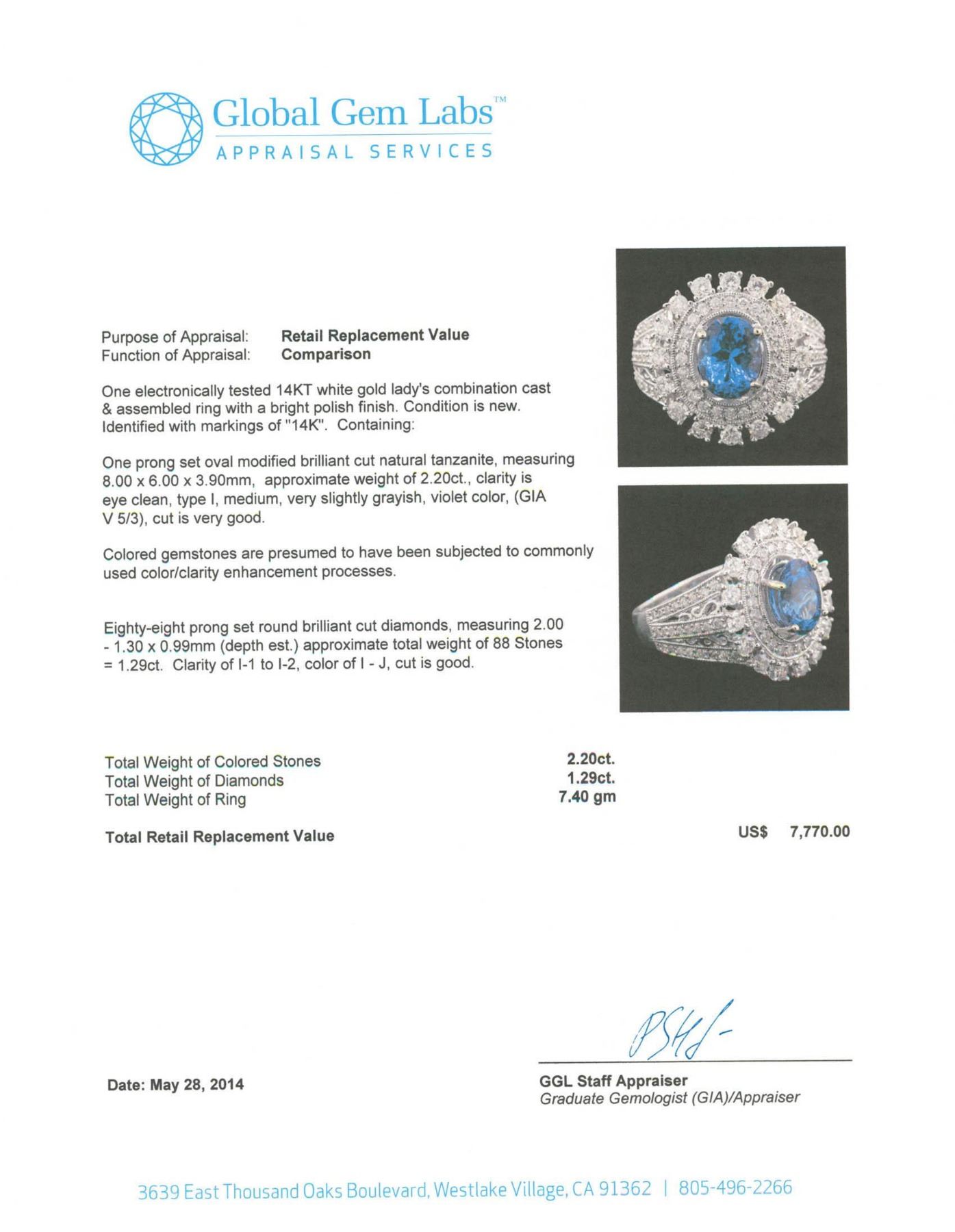 One electronically tested 14KT white gold Ladies combination cast & assembled ring with a bright polish finish. Condition is new. Identified with markings of "14K". Containing: One prong set oval modified brilliant cut natural tanzanite, measuring 8.00 x 6.00 x 3.90mm, approximate weight of 2.20 ct., clarity is eye clean, type I, medium, very slightly grayish, violet color, (GIA V 5/3), cut is very good. Colored gemstones are presumed to have been subjected to commonly used color/clarity enhancement processes. Eighty-Eight prong set round brilliant cut diamonds, measuring 2.00 - 1.30 x 0.99mm (depth est.) approximate. Total Weight of 88 Stones = 1.29ct. Clarity: I-1 to I-2. Color: I - J, Cut is Good. Total Weight of Colored Stones 2.20 ct. Total Weight of Diamonds 1.29ct. Total Weight of Ring 7.40 grams. GGL Appraised.