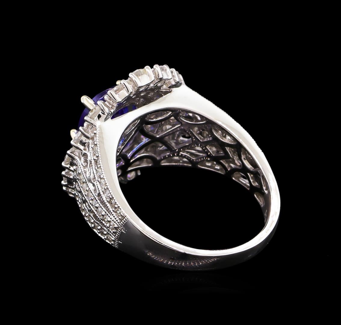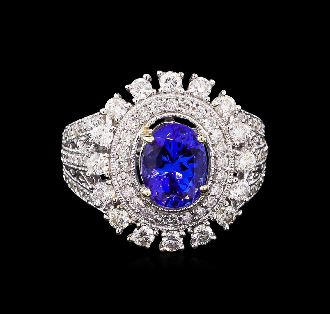 One electronically tested 14KT white gold Ladies combination cast & assembled ring with a bright polish finish. Condition is new. Identified with markings of "14K". Containing: One prong set oval modified brilliant cut natural tanzanite, measuring 8.00 x 6.00 x 3.90mm, approximate weight of 2.20 ct., clarity is eye clean, type I, medium, very slightly grayish, violet color, (GIA V 5/3), cut is very good. Colored gemstones are presumed to have been subjected to commonly used color/clarity enhancement processes. Eighty-Eight prong set round brilliant cut diamonds, measuring 2.00 - 1.30 x 0.99mm (depth est.) approximate. Total Weight of 88 Stones = 1.29ct. Clarity: I-1 to I-2. Color: I - J, Cut is Good. Total Weight of Colored Stones 2.20 ct. Total Weight of Diamonds 1.29ct. Total Weight of Ring 7.40 grams. GGL Appraised.