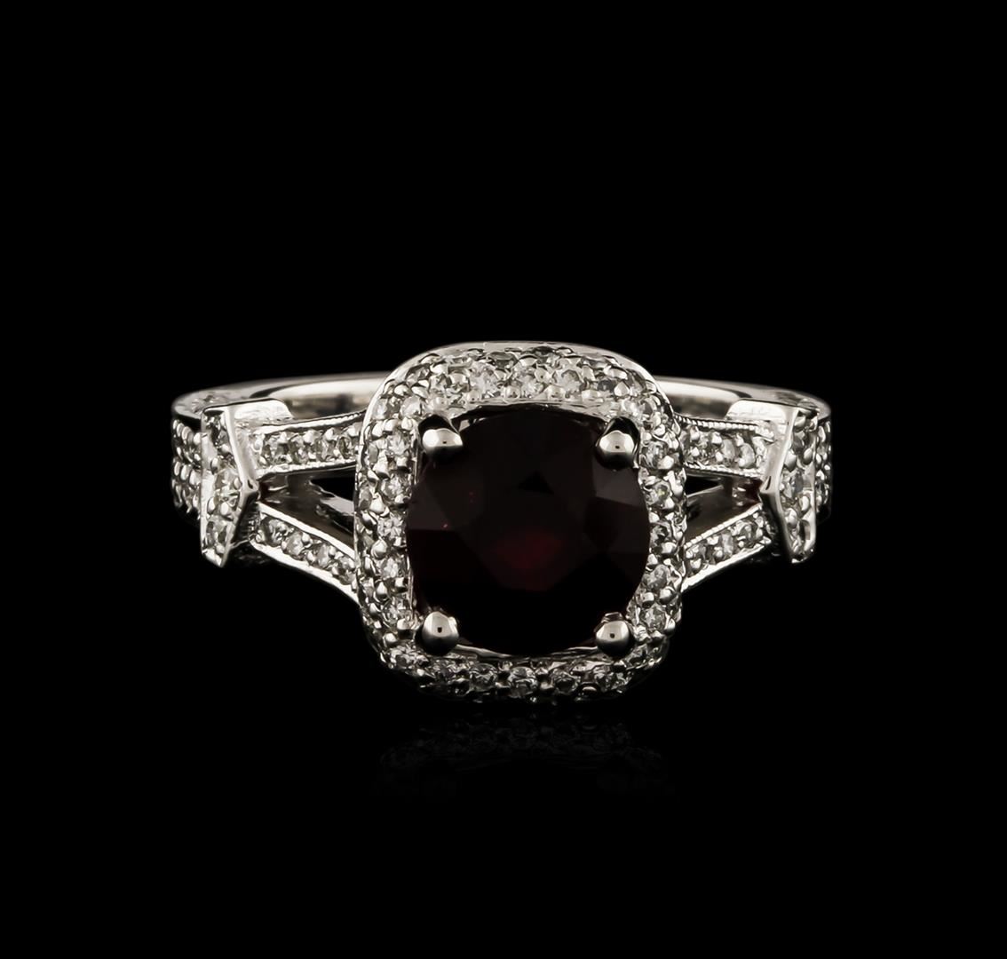 One electronically tested 14KT white gold ladies cast ruby and diamond ring with a bright polish finish. Identified with markings of "14K". Condition is new. Containing: One prong set oval round modified brilliant cut natural ruby, measuring 7.50 - 7.50 x 4.88 mm, approximate weight of 2.20ct., clarity is heavily included, type II, medium dark, moderately strong, strongly purplish red color, (GIA stpR 6/4), cut is good. One Hundred Fifty-Four prong set round brilliant cut diamonds, measuring 1.10 - 1.10 x 0.66mm (depth est.) approximate total weight of 154 Stones = 0.74ct. Clarity: SI-1 to I-1. Color: I - J, Cut is Good. Colored gemstones are presumed to have been subjected to commonly used enhancement processes, All diamonds and colored gemstones are graded in the mounting, unless otherwise stated. Total Weight of Colored Stones 2.20ct. Total Weight of Diamonds 0.74ct. Total Weight of Ring 7.10 grams. GGL Appraised at $3,950.00.