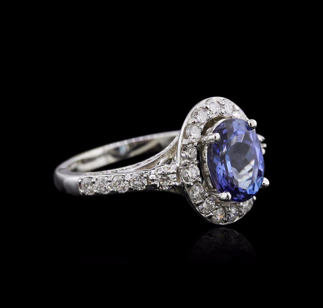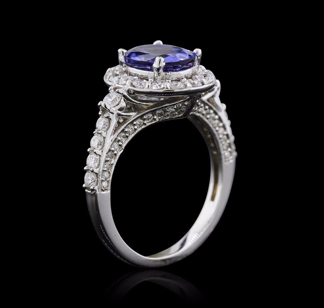 One electronically tested 14KT white gold ladies combination cast & assembled tanzanite and diamond ring with a half round shank with a bright polish finish. Identified with markings of "K14". Condition is new. Containing: One prong set oval modified brilliant cut natural tanzanite, measuring 9.55 x 7.23 x 4.61mm, exact weight 2.20ct., clarity is eye clean, type I, medium light, very slightly grayish, violet color, (GIA V 4/3), cut is good. Twenty-Six prong set round brilliant cut diamonds, measuring 2.50 - 1.90 x 1.32mm (depth est.) approximate total weight of 26 Stones = 0.87ct. Clarity: SI-1 to SI-2. Color: H - I, Cut is Good. Forty-Eight prong set round brilliant cut diamonds, measuring 1.10 - 1.10 x 0.66mm (depth est.) approximate total weight of 48 Stones = 0.23ct. Clarity: SI-2 to I-1. Color: G - H, Cut is Good. All diamonds and colored gemstones are graded in the mounting, unless otherwise stated. Colored gemstones are presumed to have been subjected to commonly used enhancement processes.. Total Weight of Colored Stones 2.20ct. Total Weight of Diamonds 1.10ct. Total Weight of Ring 5.00 grams. GGL Appraised at $4,280.00.