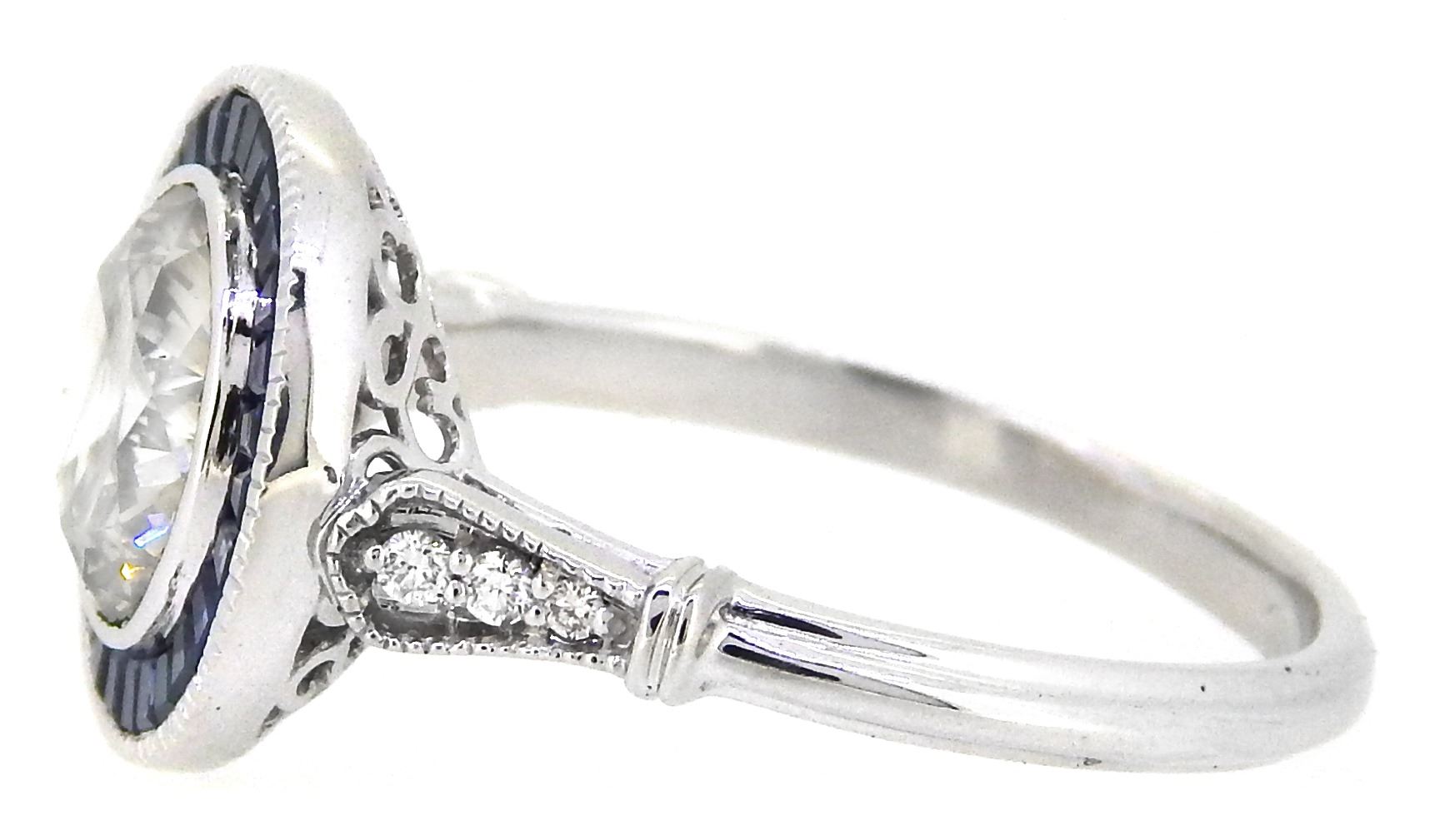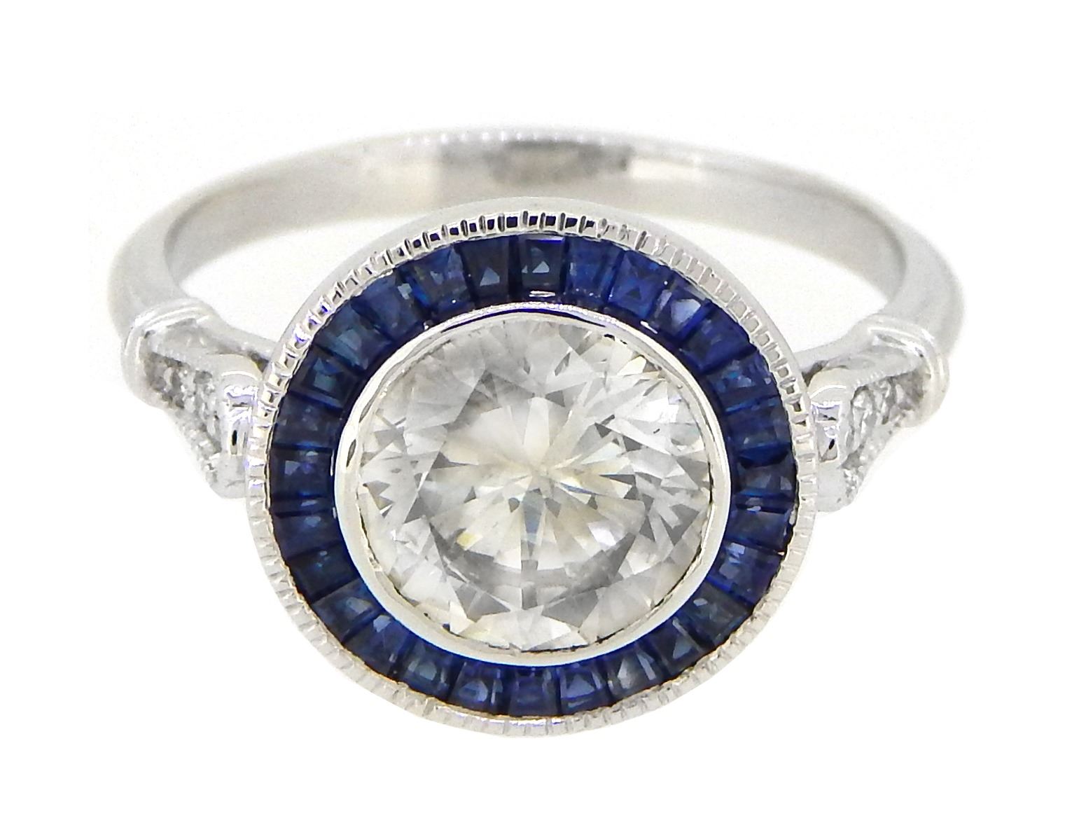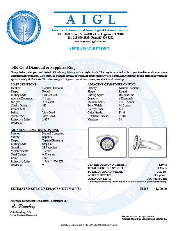 One 14KT White Gold 2.20ctw Diamond and Sapphire Ring. (1) Round Center Diamond with a total weight of 2.10cts with a color of D and clarity of SI-2. (6) side Diamonds with a total weight of 0.10cts. (28) Blue Sapphires with a total weight of 0.75cts. Total weight of this ring is 3.5 grams.
