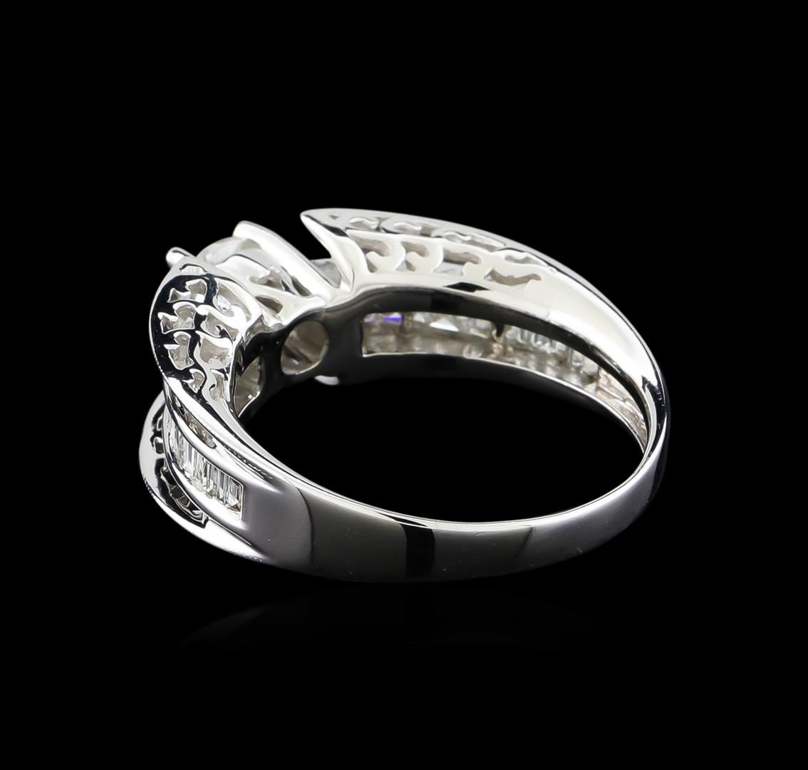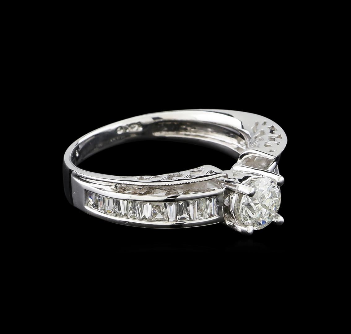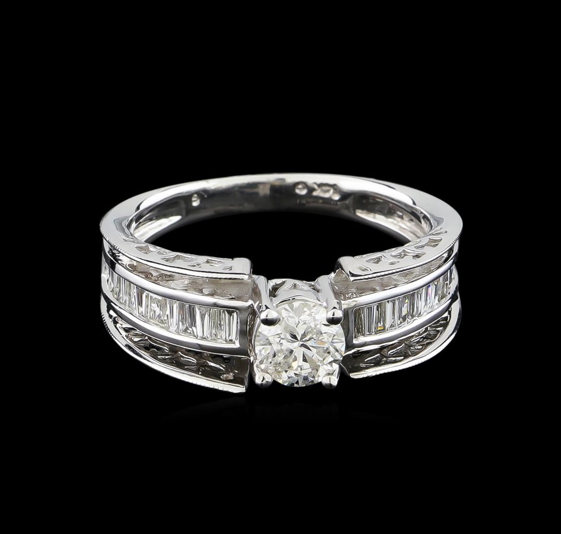 One electronically tested 14KT white gold ladies combination cast & assembled engagement ring with a flat shank with a bright polish finish. Identified with markings of "14K". Condition is new. Containing: One prong set round brilliant cut diamond, measuring 5.63 - 5.62 x 3.38mm (depth est.) approximate weight of 0.65ct. Clarity: I-2. Color: I, Cut is Good. Twenty-Eight channel set baguette cut diamonds, measuring 2.00 x 1.50 x 1.28mm (depth est.) approximate total weight of 28 Stones = 1.56ct. Clarity: SI-1 to I-1. Color: I - J, Cut is Good. All diamonds are graded in the mounting, unless otherwise stated. Total Weight of Diamonds 2.21ct. Total Weight of Ring 4.90 grams. GGL Appraised at $6,995.00.
