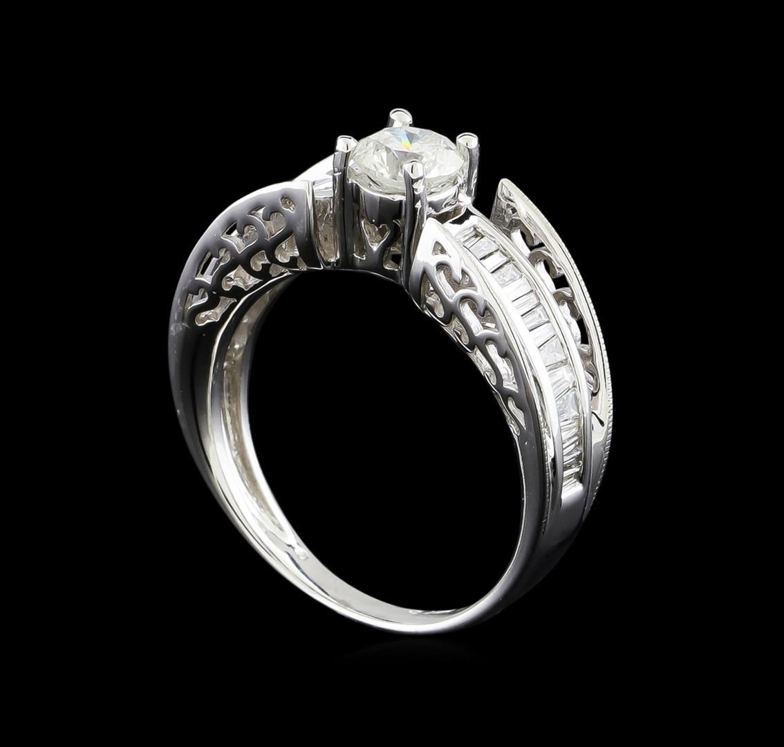One electronically tested 14KT white gold ladies combination cast & assembled engagement ring with a flat shank with a bright polish finish. Identified with markings of "14K". Condition is new. Containing: One prong set round brilliant cut diamond, measuring 5.63 - 5.62 x 3.38mm (depth est.) approximate weight of 0.65ct. Clarity: I-2. Color: I, Cut is Good. Twenty-Eight channel set baguette cut diamonds, measuring 2.00 x 1.50 x 1.28mm (depth est.) approximate total weight of 28 Stones = 1.56ct. Clarity: SI-1 to I-1. Color: I - J, Cut is Good. All diamonds are graded in the mounting, unless otherwise stated. Total Weight of Diamonds 2.21ct. Total Weight of Ring 4.90 grams. GGL Appraised at $6,995.00.
