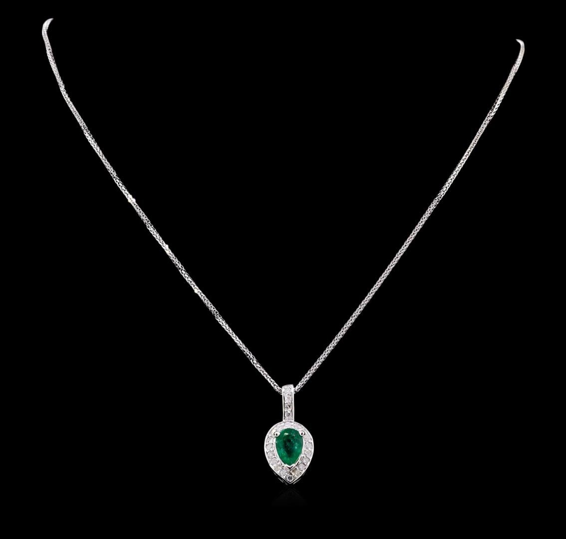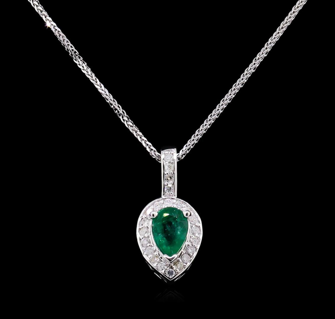 One electronically tested 14KT white gold ladies cast & assembled emerald and diamond pendant with chain. Condition is new, good workmanship. The pendant features an emerald set within a diamond bezel, completed by a diamond set bail. The pendant is supported by an eighteen inch length 14KT white gold designer style chain, terminating in a lobster claw clasp. Bright polish finish. Identified with markings of "14K". Containing: One prong set pear mixed cut natural emerald, measuring 10.52 x 6.80 x 5.20mm, 10%. bulge factor, approximate weight of 2.21ct., clarity is heavily included, type III, medium dark, moderately strong, very slightly bluish green color, (GIA vslbG 6/4), cut is good. Transmitting light with a minimum of distortion, transparent. Naturally occurring internal & external characteristics are present. Indications of oil residue. Graded in the setting. Twenty-Two prong set round brilliant cut diamonds, measuring 1.80 - 1.70 x 1.05mm (depth est.) approximate. Total Weight of 22 Stones = 0.52ct. Graded in the setting. Clarity: I-1 to I-2. Color: G - I. Total Weight of Colored Stones 2.21ct. Total Weight of Diamonds 0.52ct. Total Weight of Pendant With Chain 7.53 grams. AIG Appraised at $6,740.00.