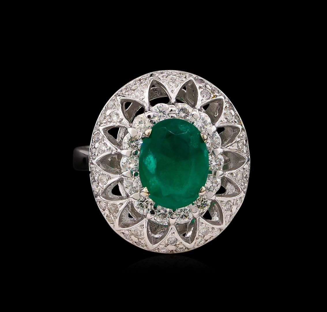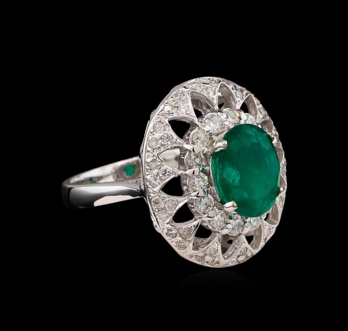 One electronically tested 14KT white gold Ladies combination cast & assembled ring with a bright polish finish. Condition is new. Identified with markings of "14K". Containing: One prong set oval modified brilliant cut natural emerald, measuring 10.10 x 7.80 x 5.07mm, approximate weight of 2.21ct., clarity is heavily included, type III, medium dark, moderately strong, green color, (GIA G 6/4), cut is good. Colored gemstones are presumed to have been subjected to commonly used color/clarity enhancement processes. Fifty-Six prong set round brilliant cut diamonds, measuring 2.00 - 1.30 x 0.99mm (depth est.) approximate. Total Weight of 56 Stones = 0.92ct. Clarity: SI-2 to I-2. Color: H - I, Cut is Good. Total Weight of Colored Stones 2.21ct. Total Weight of Diamonds 0.92ct. Total Weight of Ring 8.50 grams. GGL Appraised at $9,220.00.