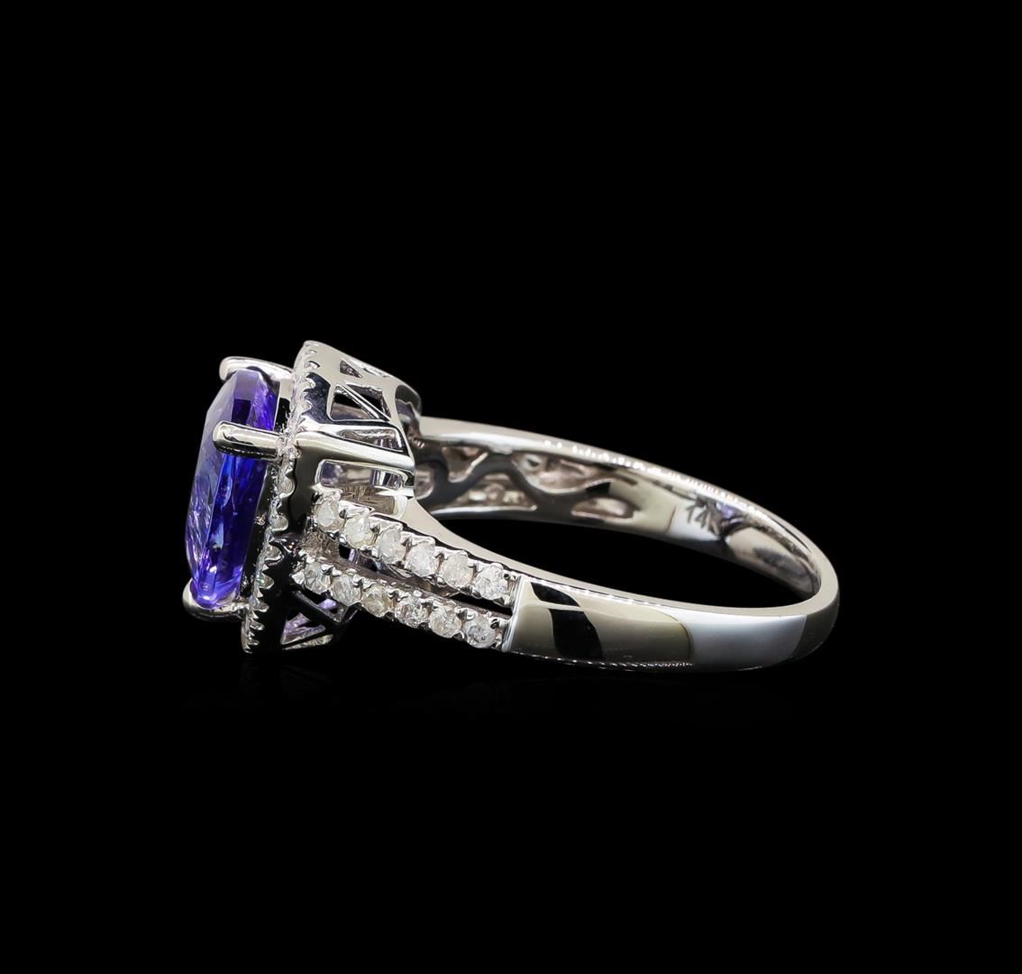 One electronically tested 14KT white gold ladies cast tanzanite and diamond ring with a split shank with a bright polish finish. Trademark is Orianne. Identified with markings of "14K". Condition is new. Containing: One prong set triangle modified brilliant cut natural tanzanite, measuring 8.51 x 8.47 x 5.09mm, approximate weight of 2.21ct., clarity is eye clean, type I, medium, very slightly grayish, violet color, (GIA V 5/3), cut is good. Forty-Eight prong set round brilliant cut diamonds, measuring 1.20 - 1.20 x 0.72mm (depth est.) approximate total weight of 48 Stones = 0.30ct. Clarity: SI-2 to I-2. Color: I - J. All diamonds and colored gemstones are graded in the mounting, unless otherwise stated. Colored gemstones are presumed to have been subjected to commonly used enhancement processes. Total Weight of Colored Stones 2.21ct. Total Weight of Diamonds 0.30ct. Total Weight of Ring 4.50 grams. GGL Appraised at $3,500.00.