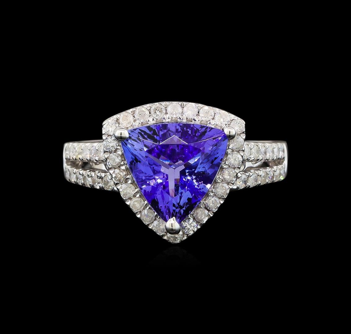 One electronically tested 14KT white gold ladies cast tanzanite and diamond ring with a split shank with a bright polish finish. Trademark is Orianne. Identified with markings of "14K". Condition is new. Containing: One prong set triangle modified brilliant cut natural tanzanite, measuring 8.51 x 8.47 x 5.09mm, approximate weight of 2.21ct., clarity is eye clean, type I, medium, very slightly grayish, violet color, (GIA V 5/3), cut is good. Forty-Eight prong set round brilliant cut diamonds, measuring 1.20 - 1.20 x 0.72mm (depth est.) approximate total weight of 48 Stones = 0.30ct. Clarity: SI-2 to I-2. Color: I - J. All diamonds and colored gemstones are graded in the mounting, unless otherwise stated. Colored gemstones are presumed to have been subjected to commonly used enhancement processes. Total Weight of Colored Stones 2.21ct. Total Weight of Diamonds 0.30ct. Total Weight of Ring 4.50 grams. GGL Appraised.