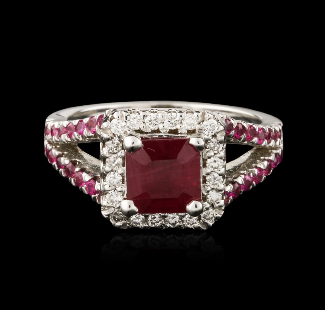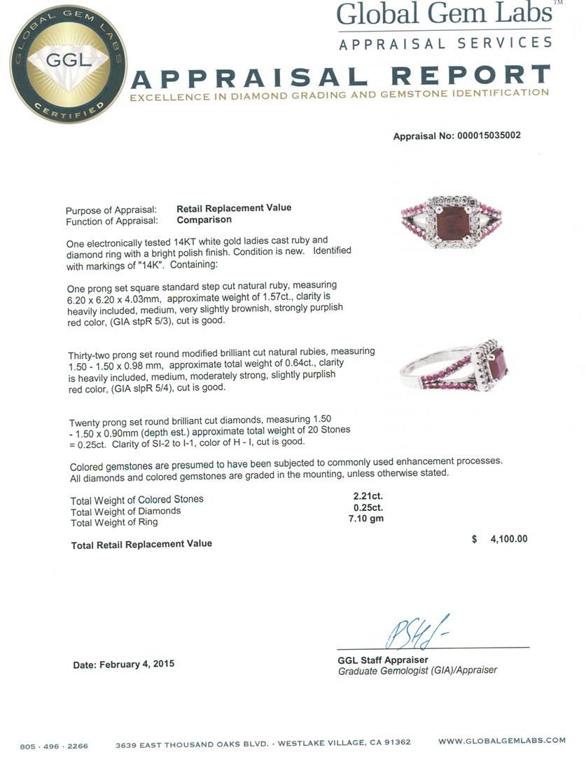 One electronically tested 14KT white gold ladies cast ruby and diamond ring with a bright polish finish. Identified with markings of "14K". Condition is new. Containing: One prong set square standard step cut natural ruby, measuring 6.20 x 6.20 x 4.03mm, approximate weight of 1.57ct., clarity is heavily included, medium, very slightly brownish, strongly purplish red color, (GIA stpR 5/3), cut is good. Thirty-two prong set round modified brilliant cut natural rubies, measuring 1.50 - 1.50 x 0.98 mm, approximate total weight of 0.64ct., clarity is heavily included, medium, moderately strong, slightly purplish red color, (GIA slpR 5/4), cut is good. Twenty prong set round brilliant cut diamonds, measuring 1.50 - 1.50 x 0.90mm (depth est.) approximate total weight of 20 Stones = 0.25ct. Clarity: SI-2 to I-1. Color: H - I, Cut is Good. Colored gemstones are presumed to have been subjected to commonly used enhancement processes. All diamonds and colored gemstones are graded in the mounting, unless otherwise stated. Total Weight of Colored Stones 2.21ct. Total Weight of Diamonds 0.25ct. Total Weight of Ring 7.10 grams. GGL Appraised at $4,100.00.