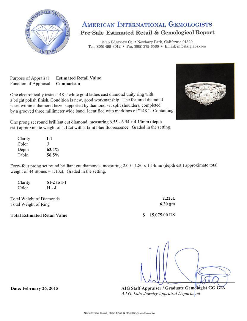 One electronically tested 14KT white gold ladies cast diamond unity ring with a bright polish finish. The featured diamond is set within a diamond bezel supported by diamond set split shoulders, completed by a grooved three millimeter wide band. Identified with markings of "14K". Condition is new, good workmanship. Containing: One prong set round brilliant cut diamond, measuring 6.55 - 6.54 x 4.15mm (depth est.) approximate weight of 1.12ct with a faint blue fluorescence. Graded in the setting. Clarity: I-1. Color: J. Depth 63.4%. Table 56.5%. Forty-Four prong set round brilliant cut diamonds, measuring 2.00 - 1.80 x 1.14mm (depth est.) approximate total weight of 44 Stones = 1.10ct. Graded in the setting. Clarity: SI-2 to I-1. Color: H - J. Total Weight of Diamonds 2.22ct. Total Weight of Ring 6.20 grams. AIG Appraised at $15,075.00.