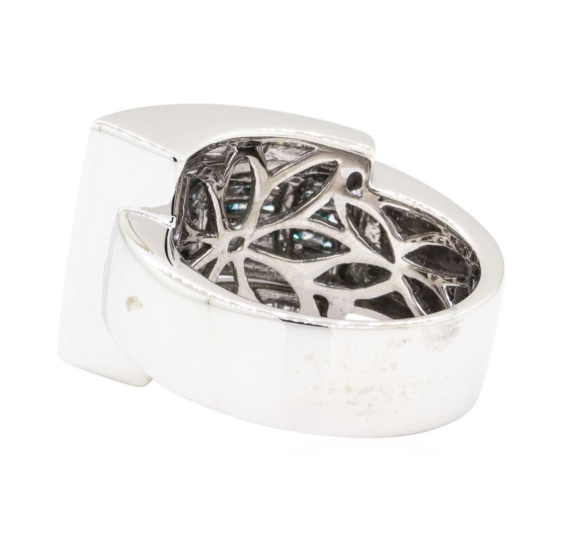 One electronically tested 14KT white gold combination cast & assembled fashion buckle ring with a bright polish finish. The featured lady's ring has a shank measuring 7.50 millimeters wide. Identified with markings of '14K'. Condition is new, good workmanship. Containing: Thirty invisible set princess cut treated diamonds, measuring 1.60 x 1.55 x 1.16mm (depth est.) approximate total weight of 30 Stones = 0.70ct. Colored gemstones are presumed to have been subjected to commonly used enhancement processes. Graded in the setting. Color Fancy Greenish Blue Clarity VS-2 to SI-1 Cut Very Good Thirty invisible set princess cut diamonds, measuring 1.60 x 1.55 x 1.16mm (depth est.) approximate total weight of 30 Stones = 0.70ct. Graded in the setting. Color H - I Clarity VS-2 to SI-2 Cut Very Good Two channel set princess cut diamonds, measuring 2.30 x 2.00 x 1.50mm (depth est.) approximate total weight of 2 Stones = 0.12ct. Graded in the setting. Color H - I Clarity VS-2 to SI-1 Cut Good Thirty-Eight channel set baguette cut diamonds, measuring from 1.50 x 1.00 x 0.85mm (depth est.) to 2.00 x 1.20 x 1.02mm (depth est.) approximate total weight of 38 Stones = 0.70ct. Graded in the setting. Color H - I Clarity SI-2 to I-1 Cut Good. Total Weight of Diamonds 2.22ct.. Total Weight of Ring 12.90gm. GAS Appraised.