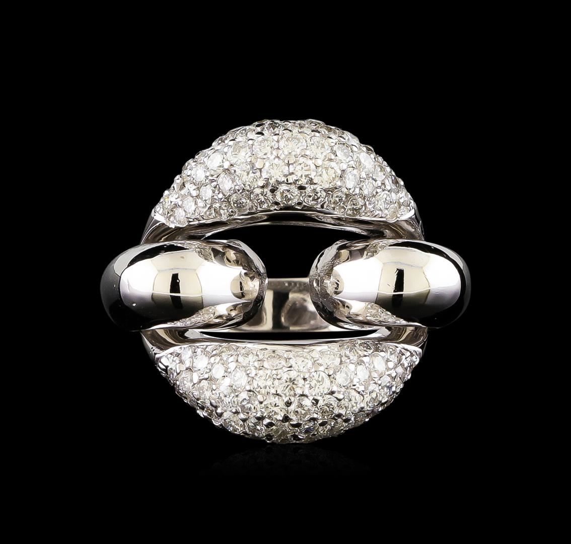 One electronically tested 14KT white gold ladies combination cast & assembled diamond ring with a flat shank with rounded edges with a bright polish finish. Identified with markings of "K14". Condition is new. Containing: One Hundred Twenty-Four prong set round brilliant cut diamonds, measuring 1.70 - 1.70 x 1.02mm (depth est.) approximate total weight of 124 Stones = 2.22ct. Clarity: SI-1 to SI-2. Color: H - J, Cut is Good. All diamonds are graded in the mounting, unless otherwise stated. Total Weight of Diamonds 2.22ct. Total Weight of Ring 11.80 grams. GGL Appraised.