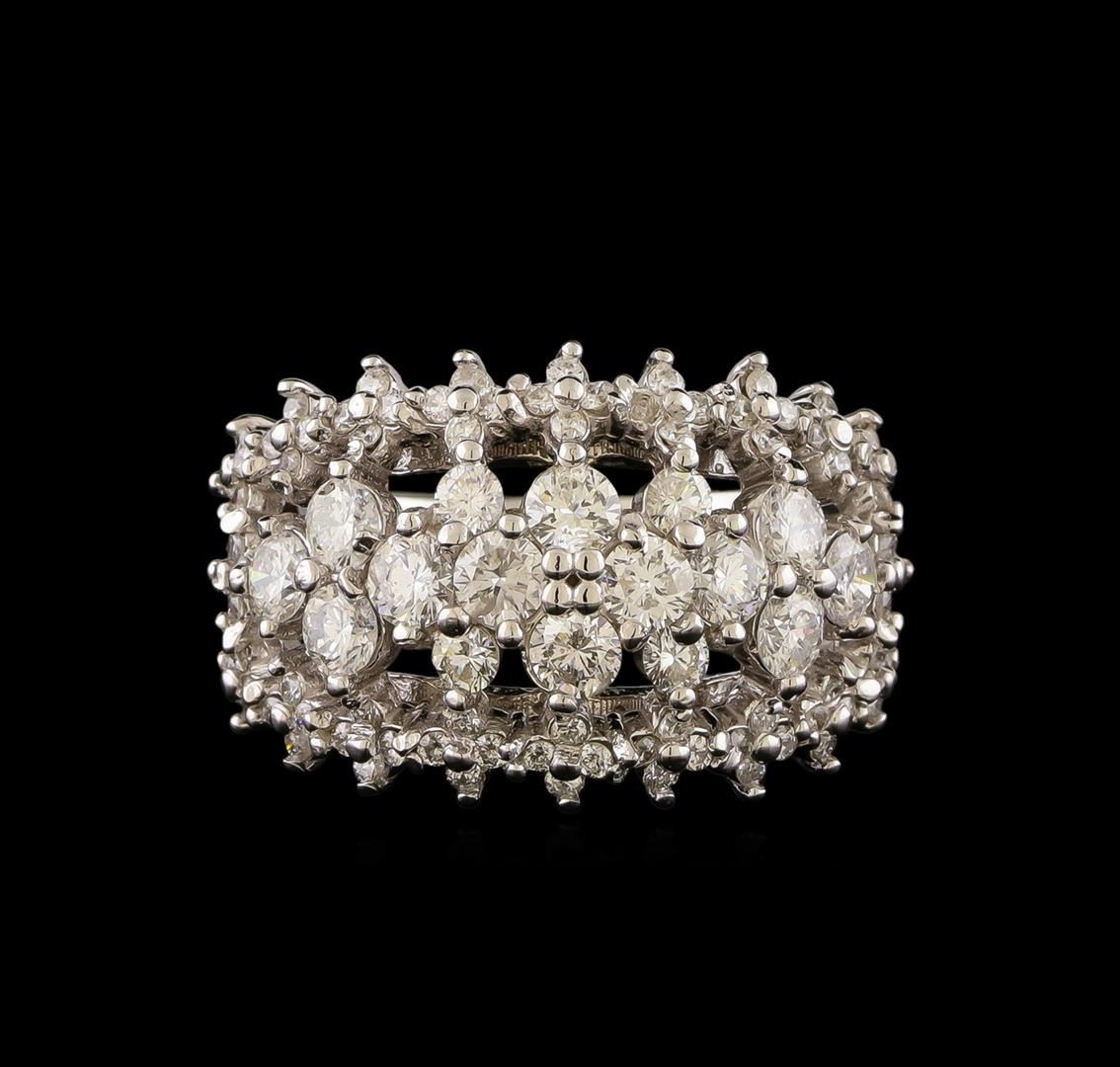 One electronically tested 14KT white gold ladies combination cast & assembled diamond ring with a bright polish finish. Identified with markings of "K14". Condition is new. Containing: Eighty prong set round brilliant cut diamonds, measuring 1.30 - 1.30 x 0.78mm (depth est.) approximate total weight of 80 Stones = 0.64ct. Clarity: I-1. Color: I - J, Cut is Good. Sixteen prong set round brilliant cut diamonds, measuring 3.50 - 2.50 x 1.80mm (depth est.) approximate total weight of 16 Stones = 1.58ct. Clarity: SI-2 to I-1. Color: H - I, Cut is Good. All diamonds are graded in the mounting, unless otherwise stated. Total Weight of Diamonds 2.22ct. Total Weight of Ring 9.50 grams. GGL Appraised.