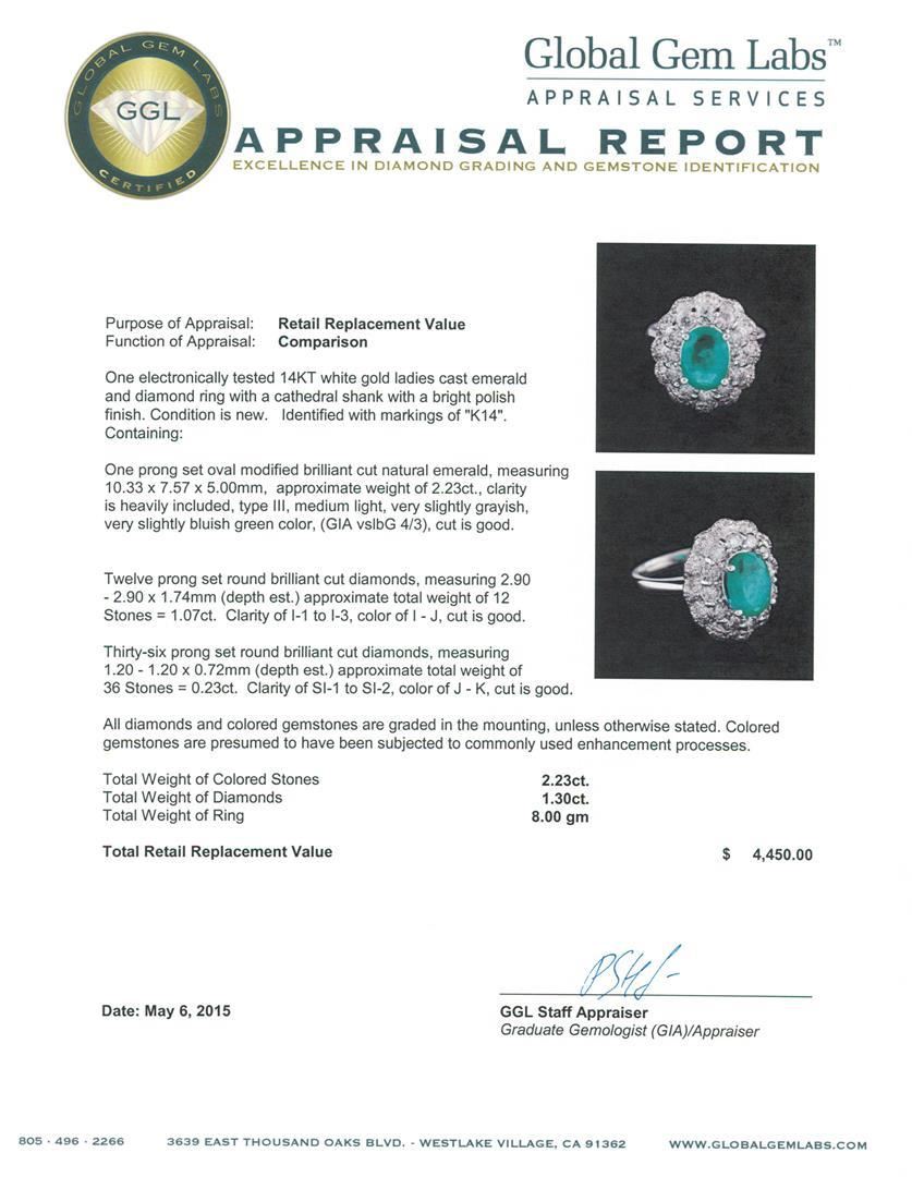 One electronically tested 14KT white gold ladies cast emerald and diamond ring with a cathedral shank with a bright polish finish. Identified with markings of "K14". Condition is new. Containing: One prong set oval modified brilliant cut natural emerald, measuring 10.33 x 7.57 x 5.00mm, approximate weight of 2.23ct., clarity is heavily included, type III, medium light, very slightly grayish, very slightly bluish green color, (GIA vslbG 4/3), cut is good. Twelve prong set round brilliant cut diamonds, measuring 2.90 - 2.90 x 1.74mm (depth est.) approximate total weight of 12 Stones = 1.07ct. Clarity: I-1 to I-3. Color: I - J, Cut is Good. Thirty-Six prong set round brilliant cut diamonds, measuring 1.20 - 1.20 x 0.72mm (depth est.) approximate total weight of 36 Stones = 0.23ct. Clarity: SI-1 to SI-2. Color: J - K, Cut is Good. All diamonds and colored gemstones are graded in the mounting, unless otherwise stated. Colored gemstones are presumed to have been subjected to commonly used enhancement processes.. Total Weight of Colored Stones 2.23ct. Total Weight of Diamonds 1.30 ct. Total Weight of Ring 8.00 grams. GGL Appraised.